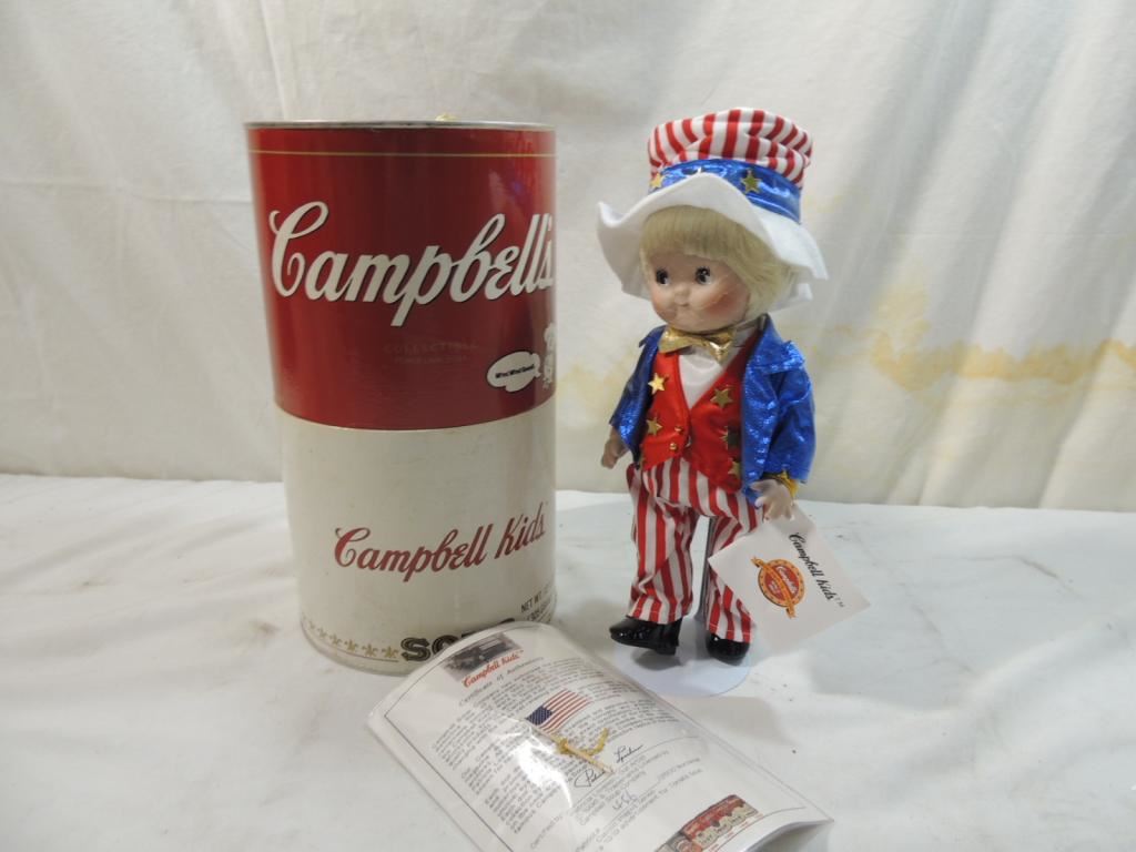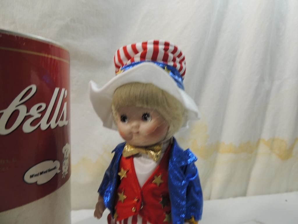 1996 CAMPBELL KIDS COLLECTIBLE DOLLS, HAND NUMBERED LIMITED EDITION EXCLUSIVE PORCELAIN, CAN CONTAINER, CAMPBELLS SOUP COLLECTIBLE, 10" TALL DOLL, COA INCLUDED. FROM PRIVATE DOLL COLLECTION, GREAT CONDITION. AS SHOWN SEE PHOTO FOR MORE DETAILS.