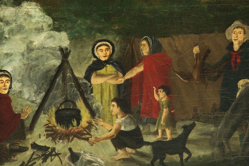 Oil on board, unsigned. Naive scene of travelers camped around a cooking fire. 24"h. 35"w., in a modern frame, 25 1/2"h. 36 1/2"w. Ex Charles & Katherine Hagler, sold at Garth's, October 1984.
