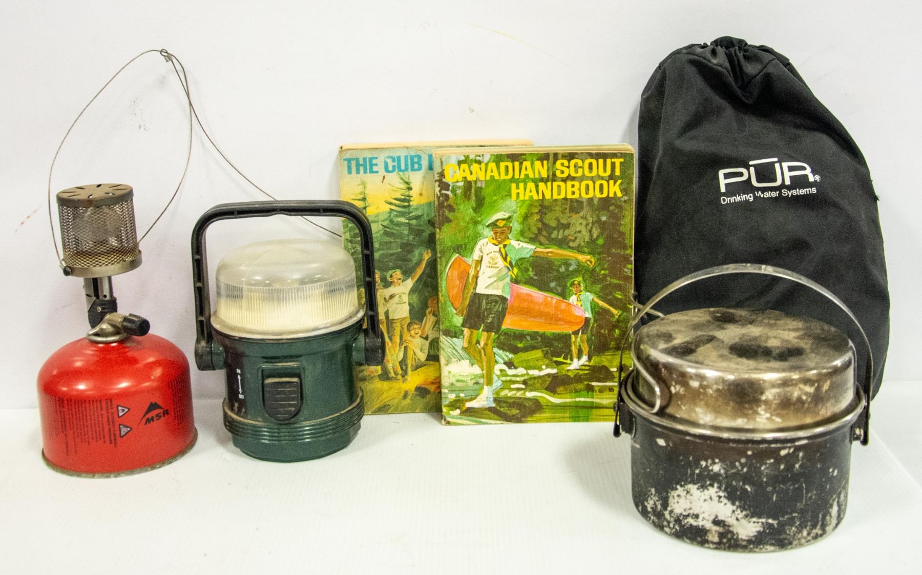PUR WATER PUMP, NESTING POT SET, MSR LANTERN (GAS), LANTERN ( 4 D CELL BATTERY OPERATED) CANADIAN SCOUT HANDBOOK, THE CUB BOOK