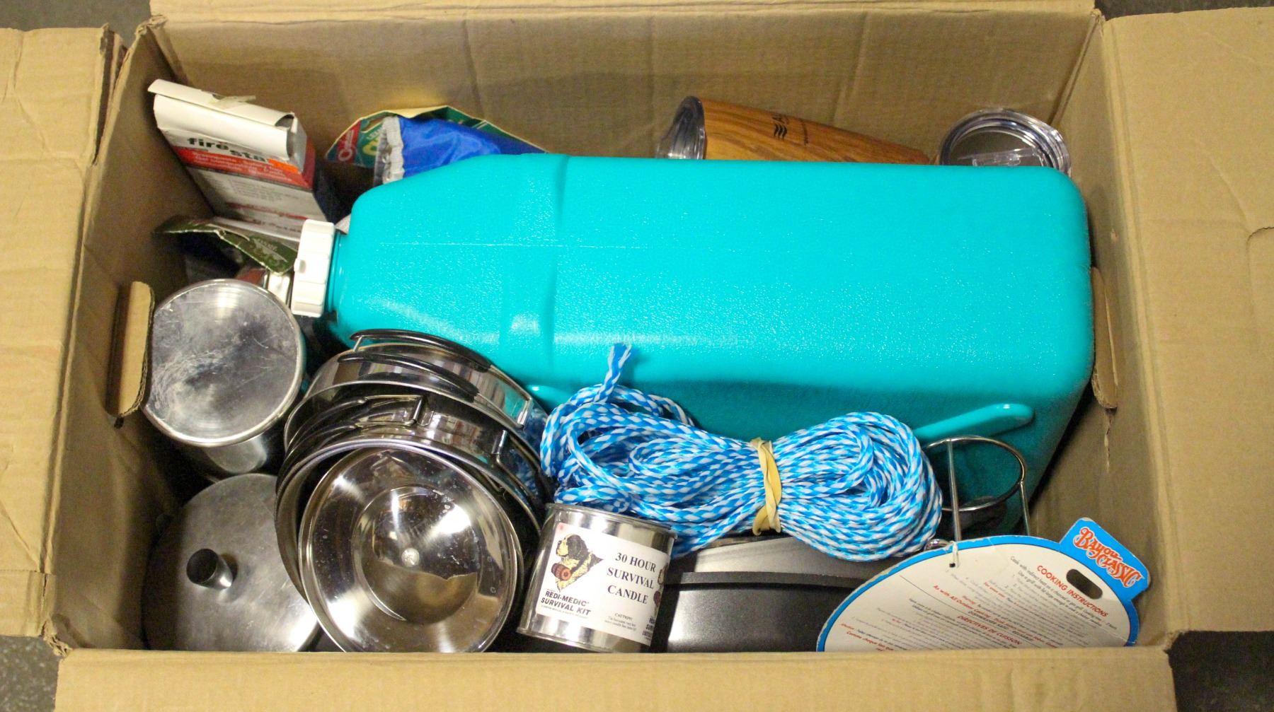 SURVIVAL CANDLE, WATER COOLER, POTS & PANS, UTENSILS, WATER BOTTLES, COFFEE POT & ROPE **ALL ITEMS MUST BE REMOVED BY 5PM SATURDAY, JUNE 28th 2025. ALL REMAINING ITEMS WILL BE SUBJECT TO A $6.00 PER DAY STORAGE CHARGE. ANY ITEMS REMAINING AFTER MONDAY, JULY 14TH 2025 WILL BE CONSIDERED FORFEITED. NO REFUNDS WILL BE ISSUED FOR FORFEITED ITEMS. TO SCHEDULE A PICK UP APPOINTMENT CLICK HERE