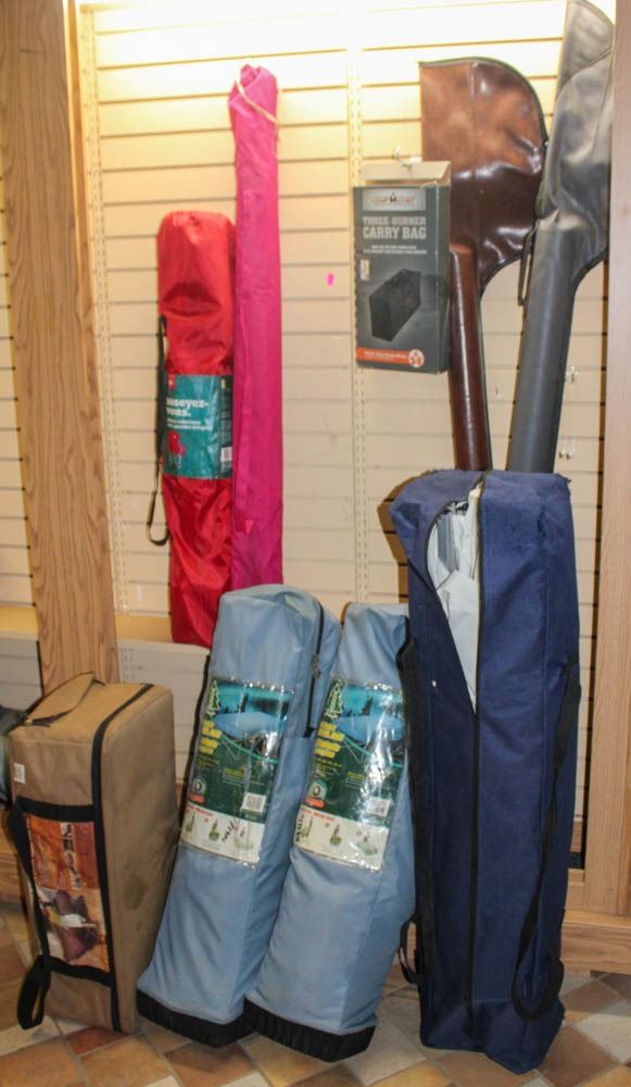POP UP SHELTER/ 3 BED IN A BAGS (NO AIR MATTRESSES) CAMP CHAIR/ BEACH UMBRELLA / FLY FISHING CASES & CARRY BAG