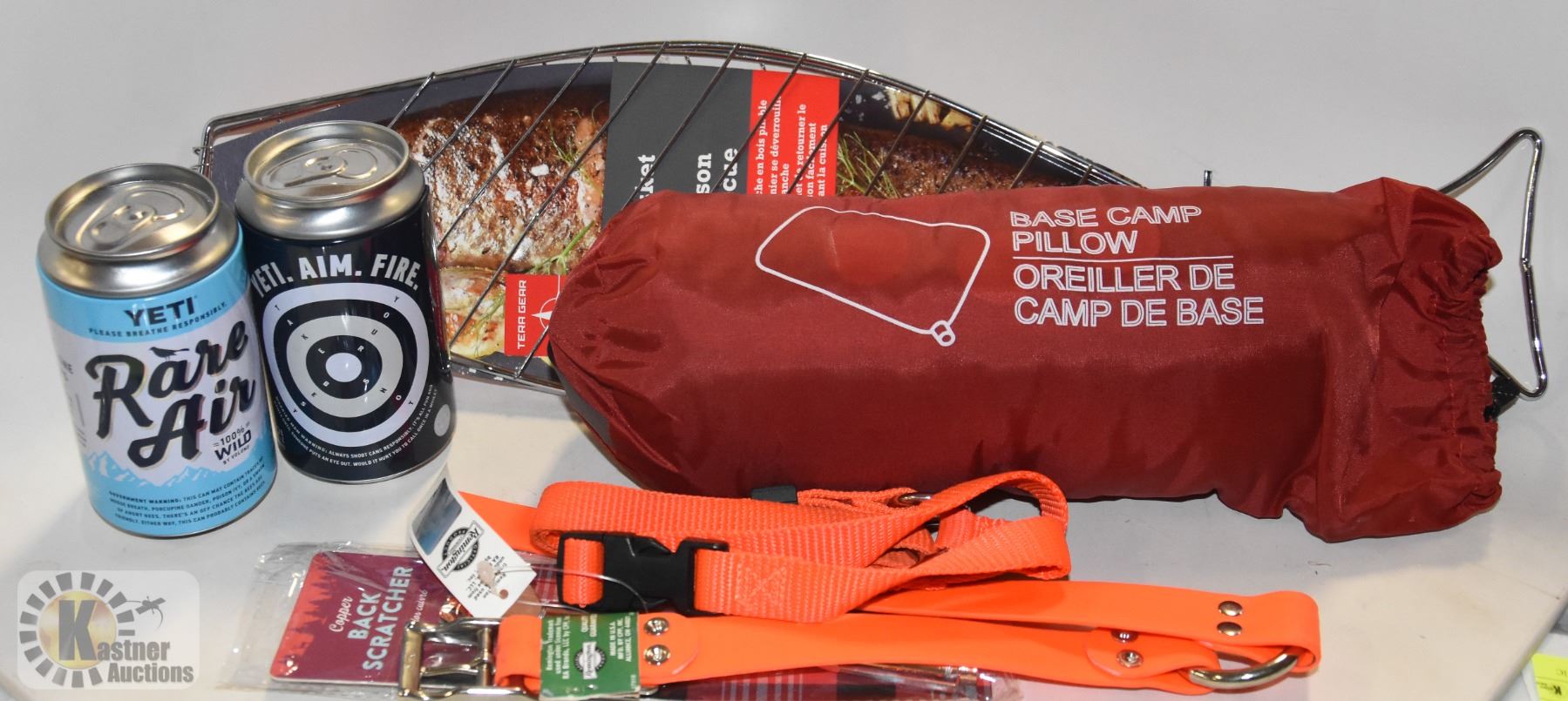2 NEW YETI STASH CANS. NEW 1 COPPER MINI BACK SCRATCHER. 1 NEW FISH GRILL BASKET. 1 NEW MOUNTAIN EQUIPMENT CO INFLATABLE CAMPING PILLOW. 2 NEW DOG COLLARS. ESTATE.-