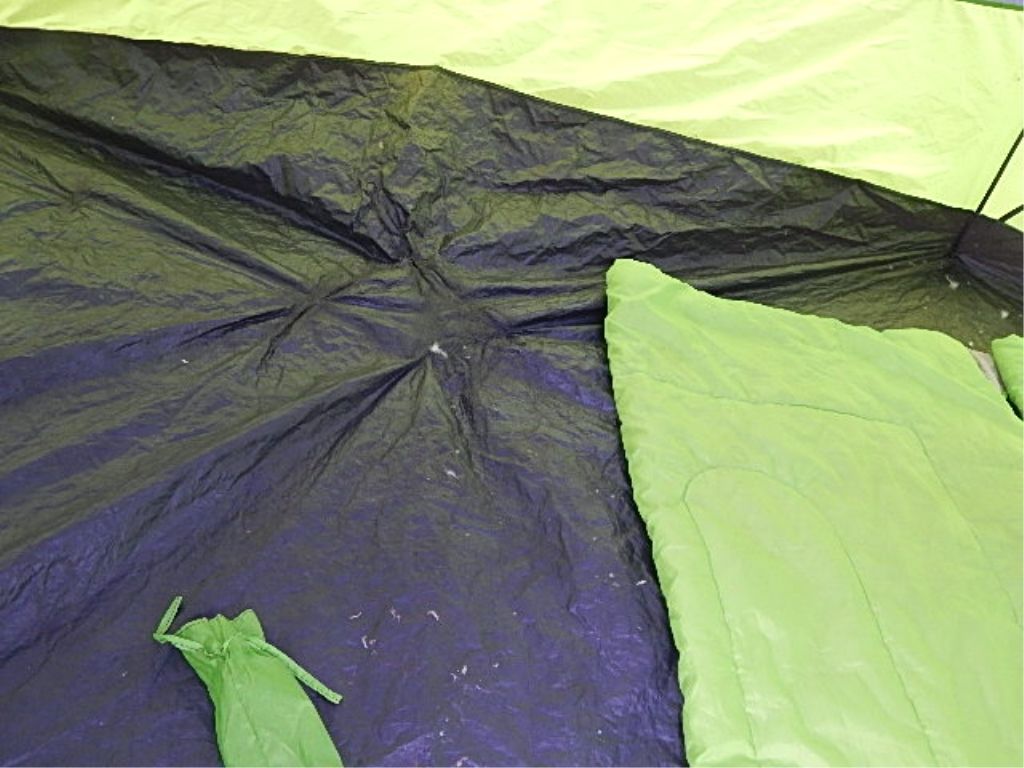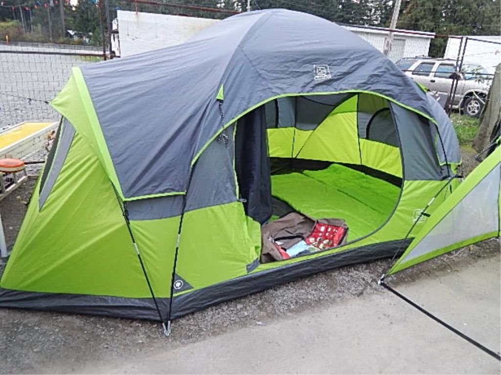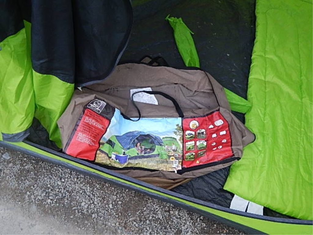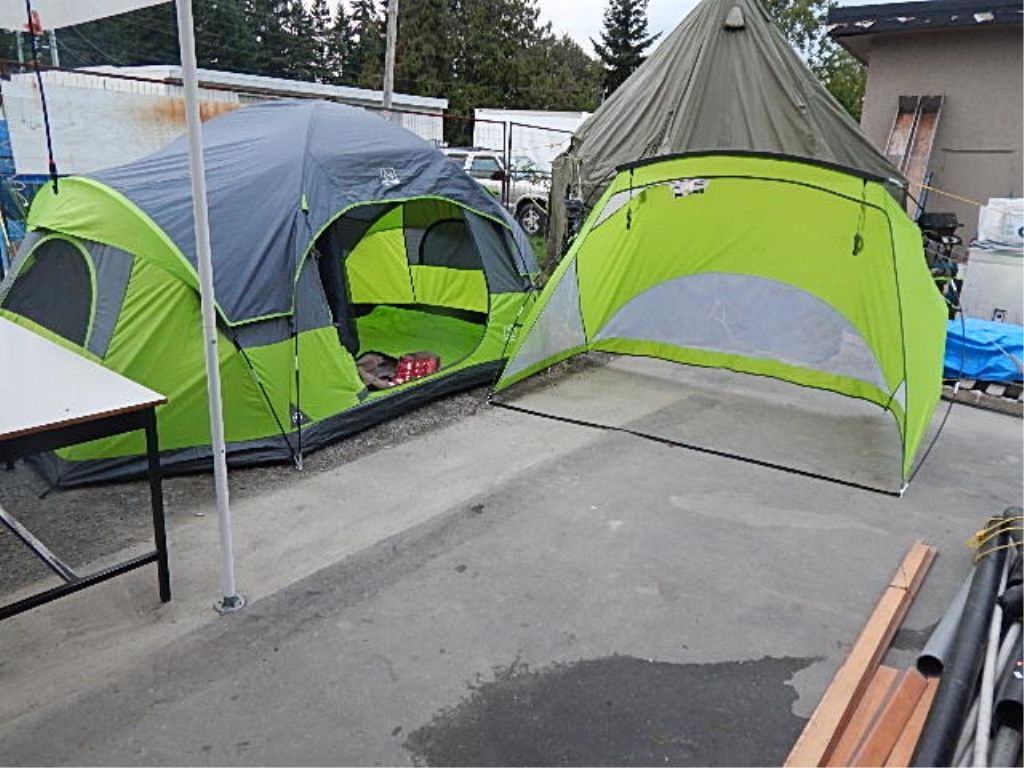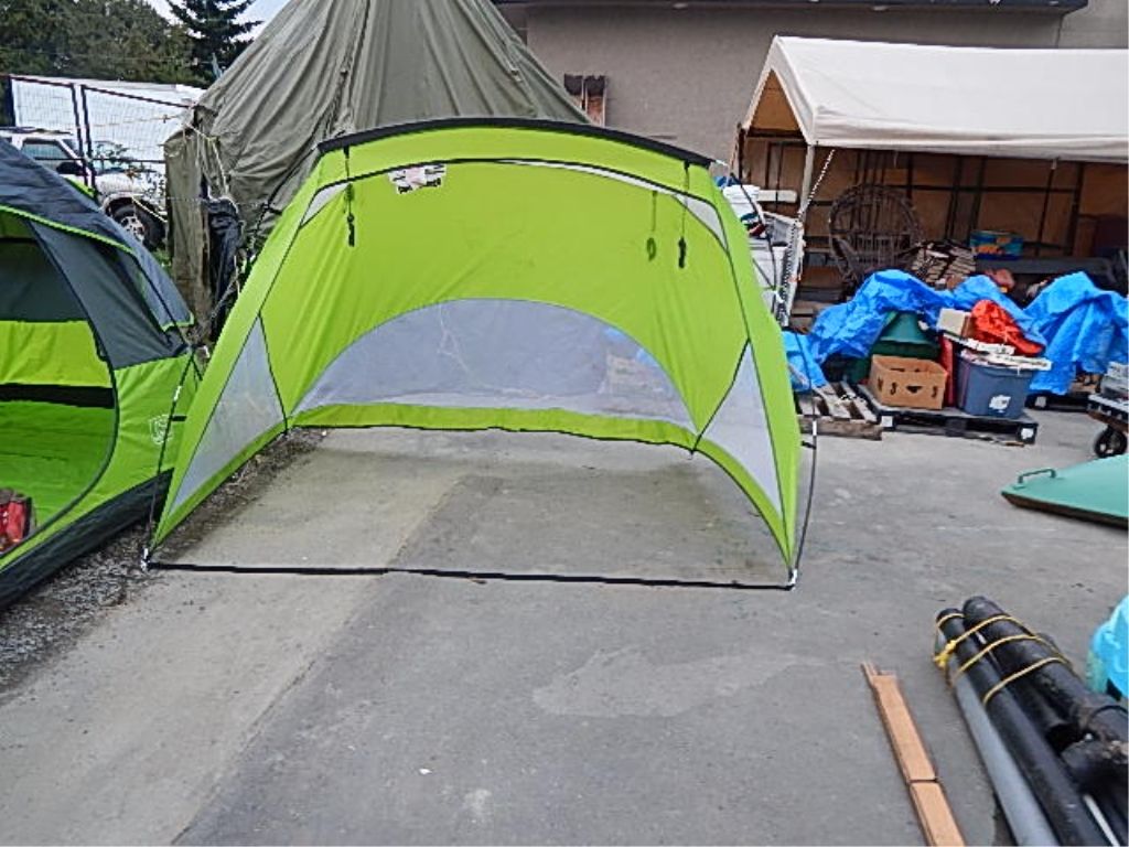 CAMPING SET - TENT, SLEEPING BAGS (2) AND PORTABLE SUN SHADE - **NOTE - TENT DAMAGED ON FLOOR BUT CAN BE MENDED)
