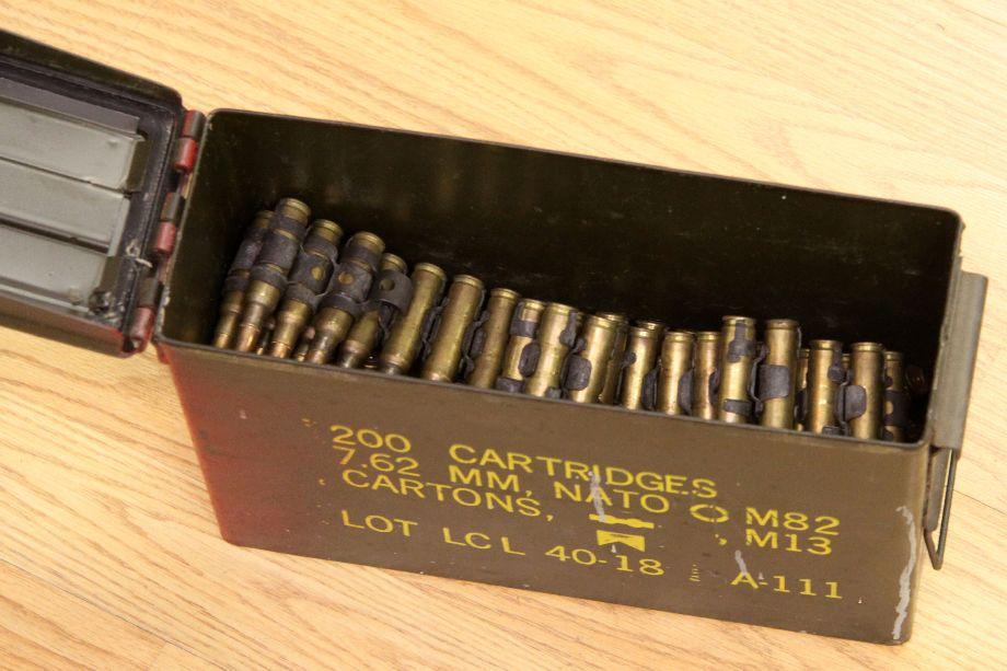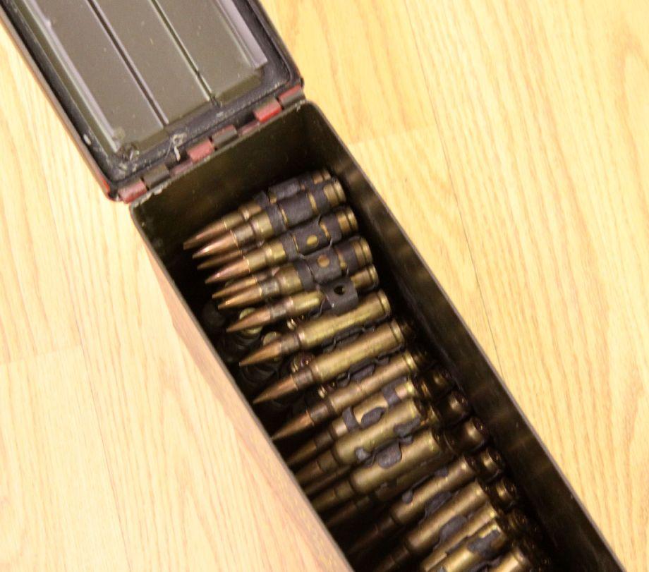 Ammunition can containing a chain of linked .308 dummy cartridges. For display use with demilitarized M-60 machine gun display. Condition very good.