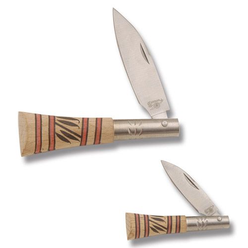 Includes One (1) 3 1/2" closed folder and One (1) 2 1/8" closed folder. Both knives have stainless blades and natural finish wood handles with painted colorful artwork. Cardboard display box.
