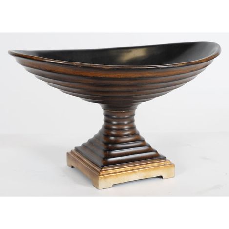 "CANA - DECO BOWL" - WITH RIBBED EDGES - NATURAL WOOD TONES NICELY DONE IN AN EVEN HAND - APPLIED FINISH - WITH GOLD IN THE SHARP LINES OF THE BASE - DIMENSIONS - 11L X 5.5D X 9H - WEIGHT - 6.5 LB