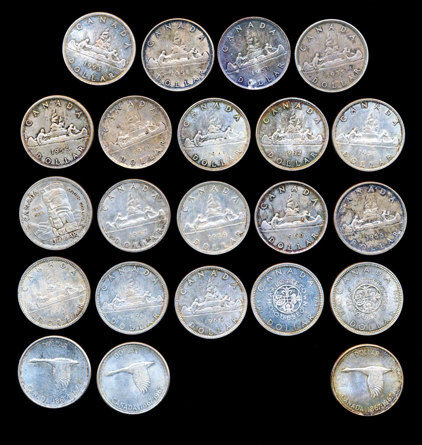 CANADA $1.00 1935-1967 A Lot of 22 Silver Dollars Very Fine- Extra Fine