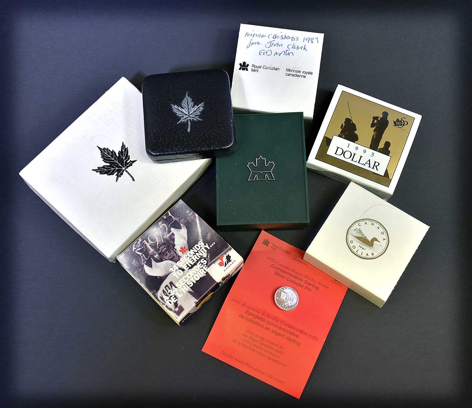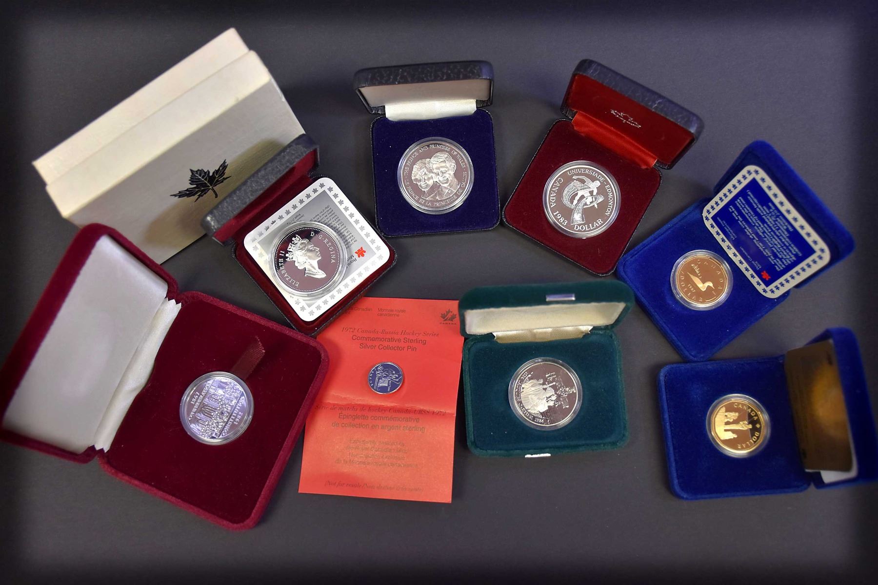 1.88 tr.oz. AG 1 x1982 Confederation Dollar in Maroon box and outer white box Specimen, 1 x 1983 Universiade Dollar in clam box and sleeve Specimen, 1 x 1983 Charles & Diania Silver medal in black box P/L, 1 x 1984 Cartier Dollar in green clam box & outer green plastic box Proof, 1 x 1987 Loon Dollar in blue clam box, COA and sleeve Proof, 1 x 1995 Peace Dollar in blue clam box, COA & sleeve Proof, and 1 x 1997 25th. Anniversary Russia/Canada series w/COA, black clam box, COA, sleeve and sterling silver collector pin on red card. Proof