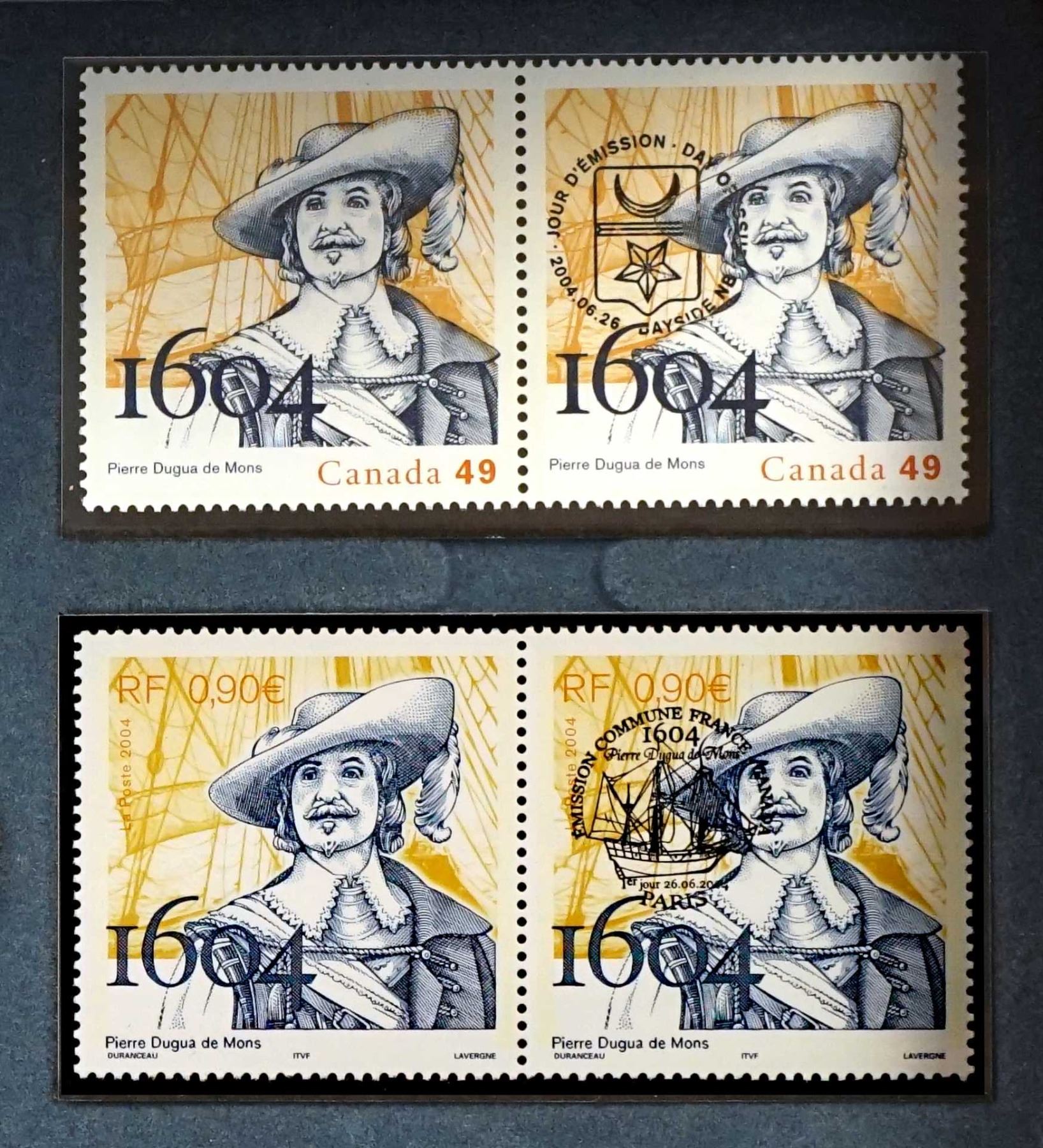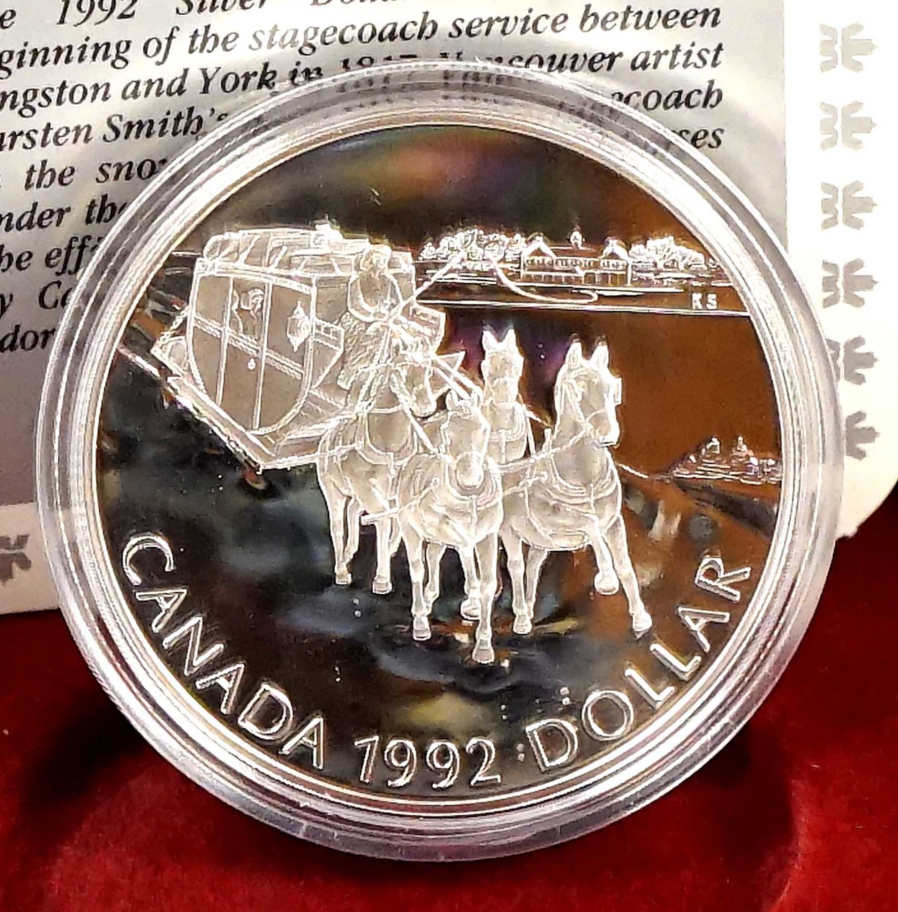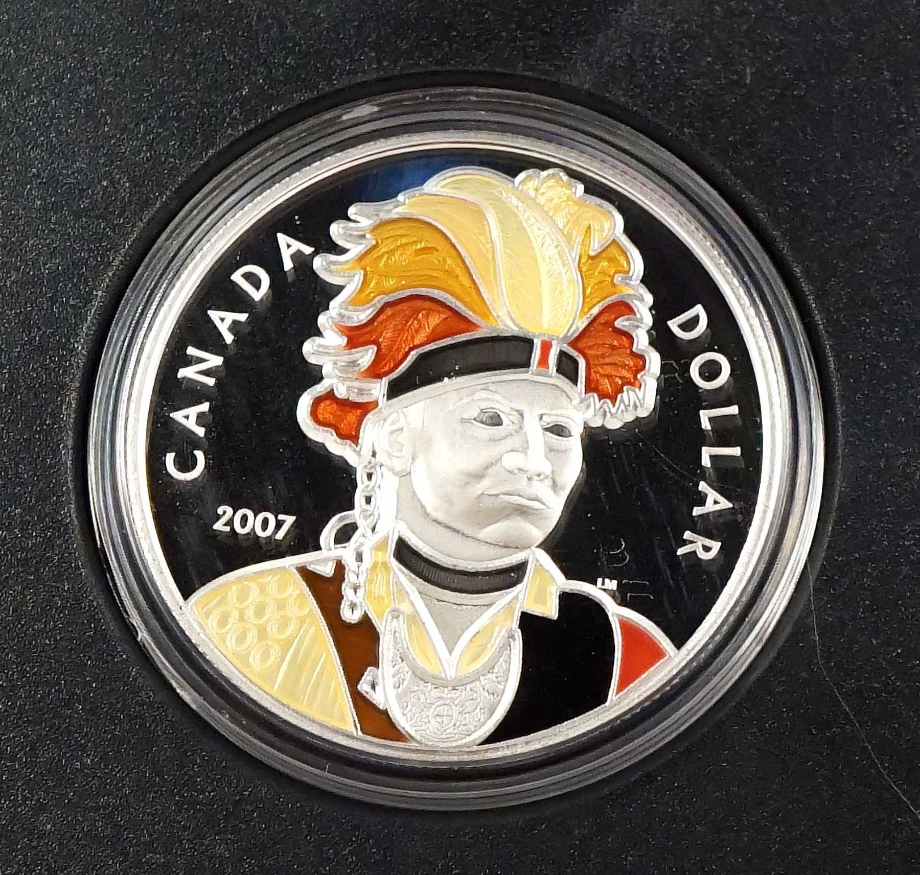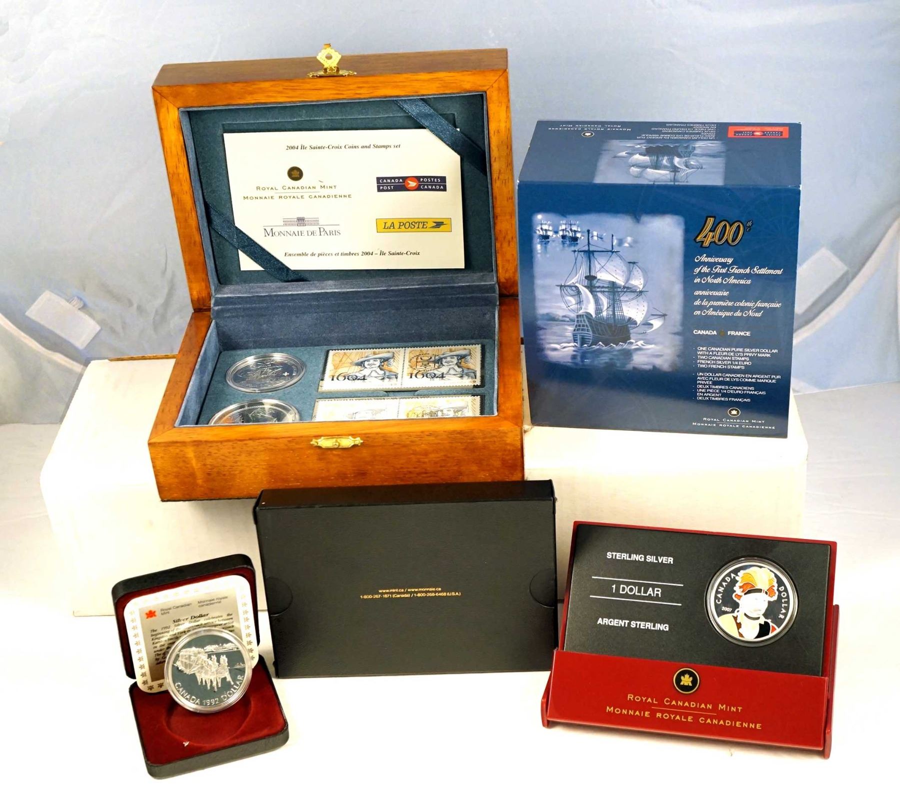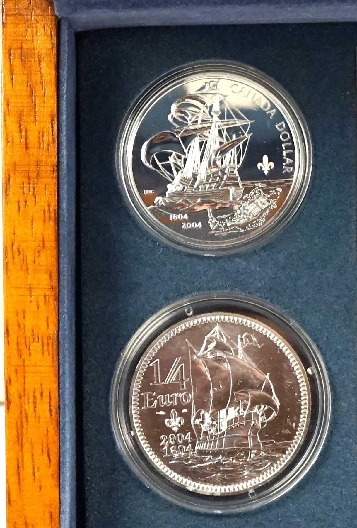 .900-925 AG 1 x 1992 Dollar w/COA, 1 x 2004 Special Privy Proof dollar, 1/4 Euro French coin and matching French and Canadian Champlain stamps in wood box with COA and sleeve, and 1 x 2007 Thayendanegea Enameled Proof dollar w/ COA, stand and sleeve.