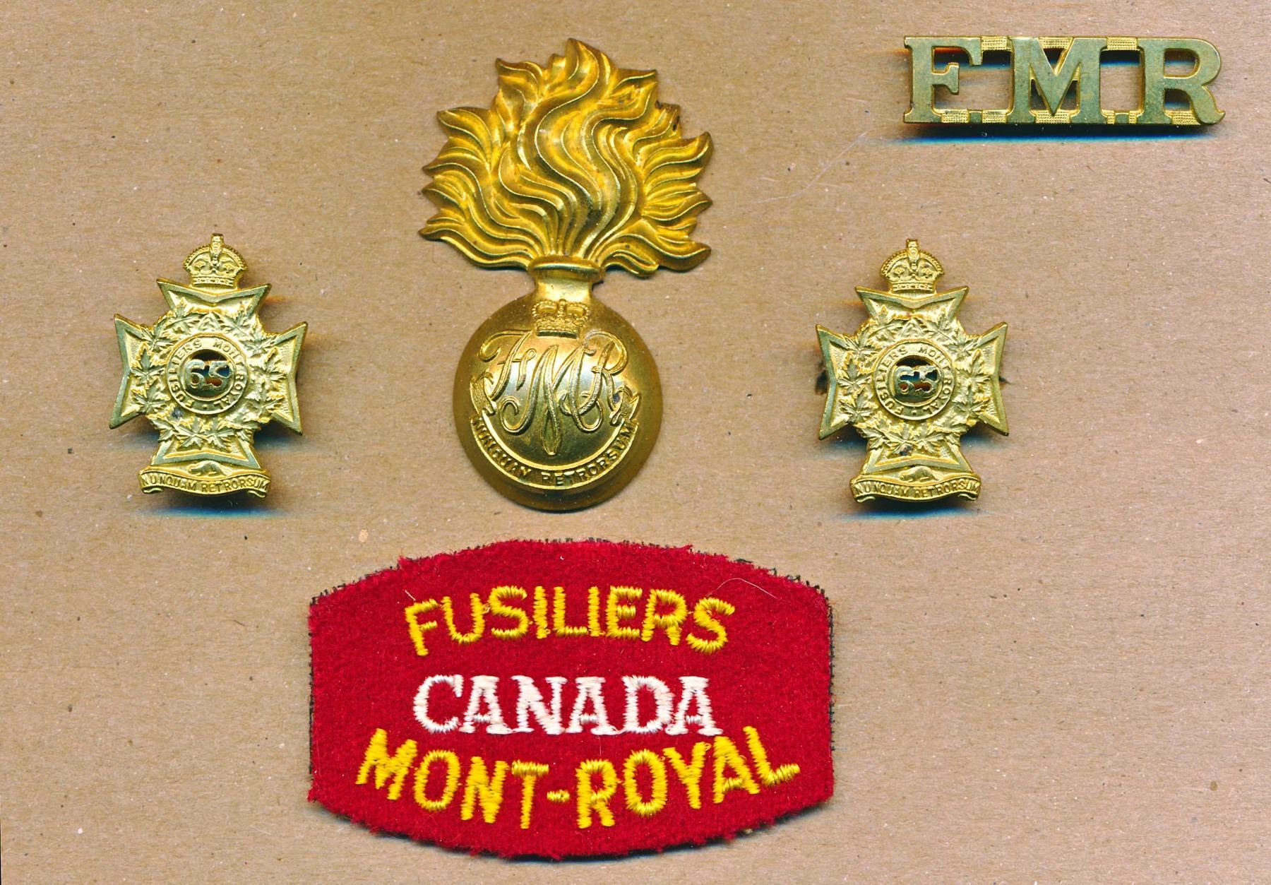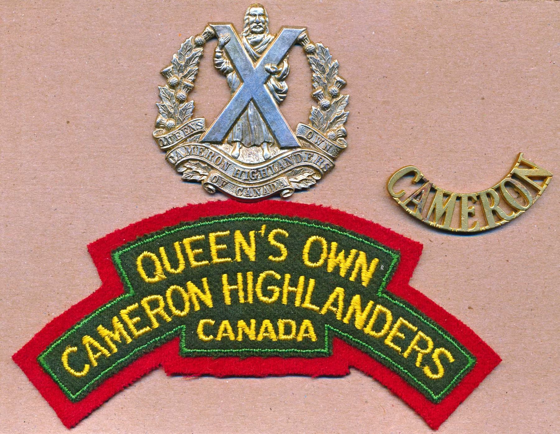 A lot of 5 pieces of the Mont-Royal Fusiliers (cap badge, 2 x collar dogs, shoulder flash and shoulder title.) & 3 pieces of Queen's Own Cameron Highlanders (cap badge, shoulder flash and shoulder title.)
