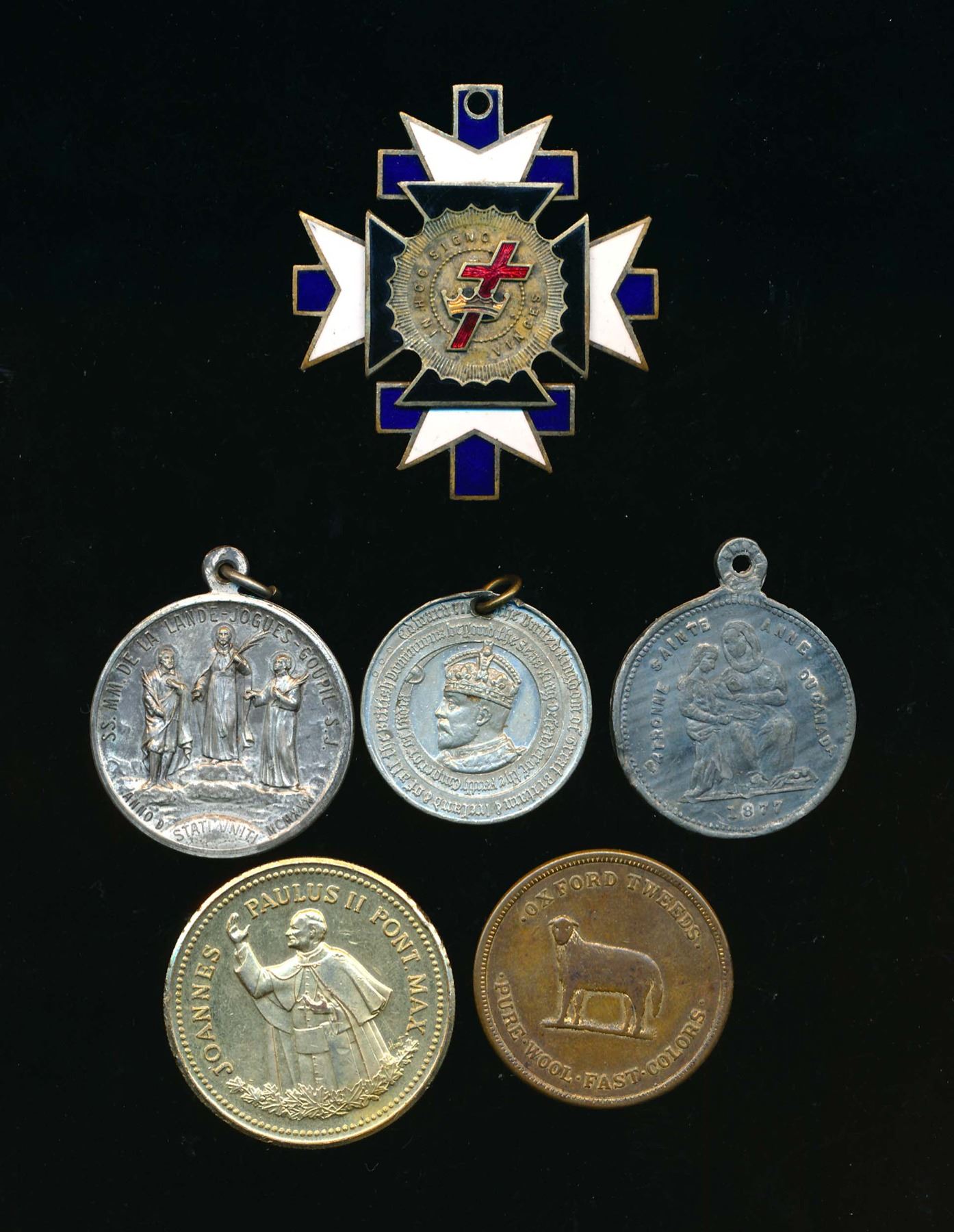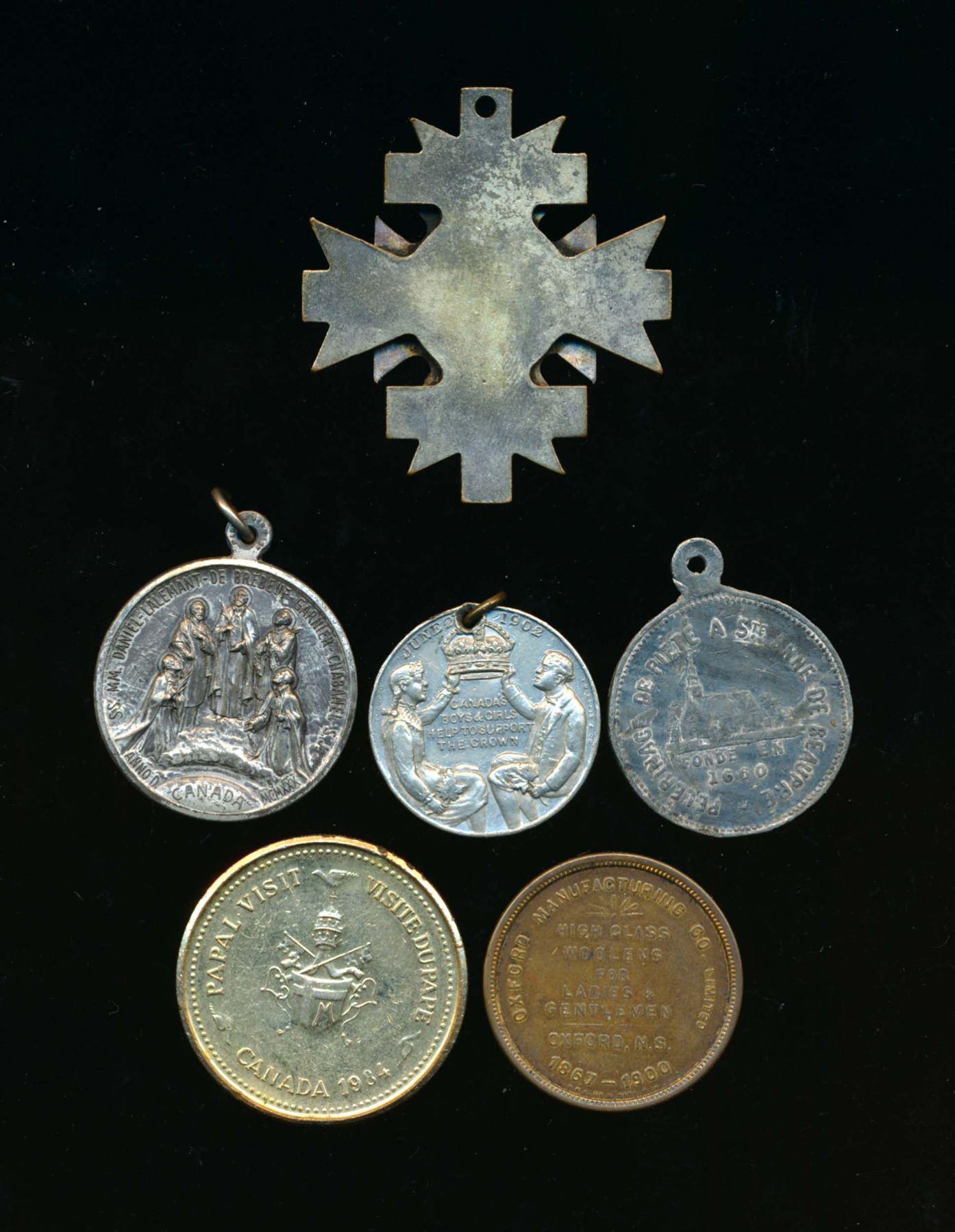 1877 Ste-Anne de Beaupre Leroux-1671 Fine, 1900 Oxford, N.S. Token Fine, 1902 Edward VII Children's medal by Ellis Bros, VF, 1930 7 Martyrs medal EF, 1984 John Paul II Visit AE-35 medal in VF and N/D Knights' Templar 50 mm. enameled medal VF (touch of enamel missing) Should be viewed.