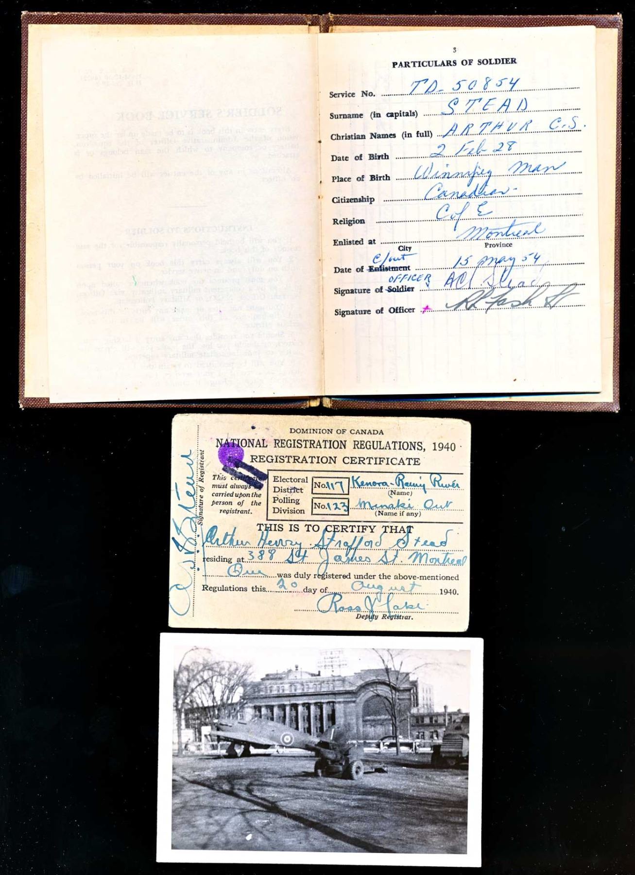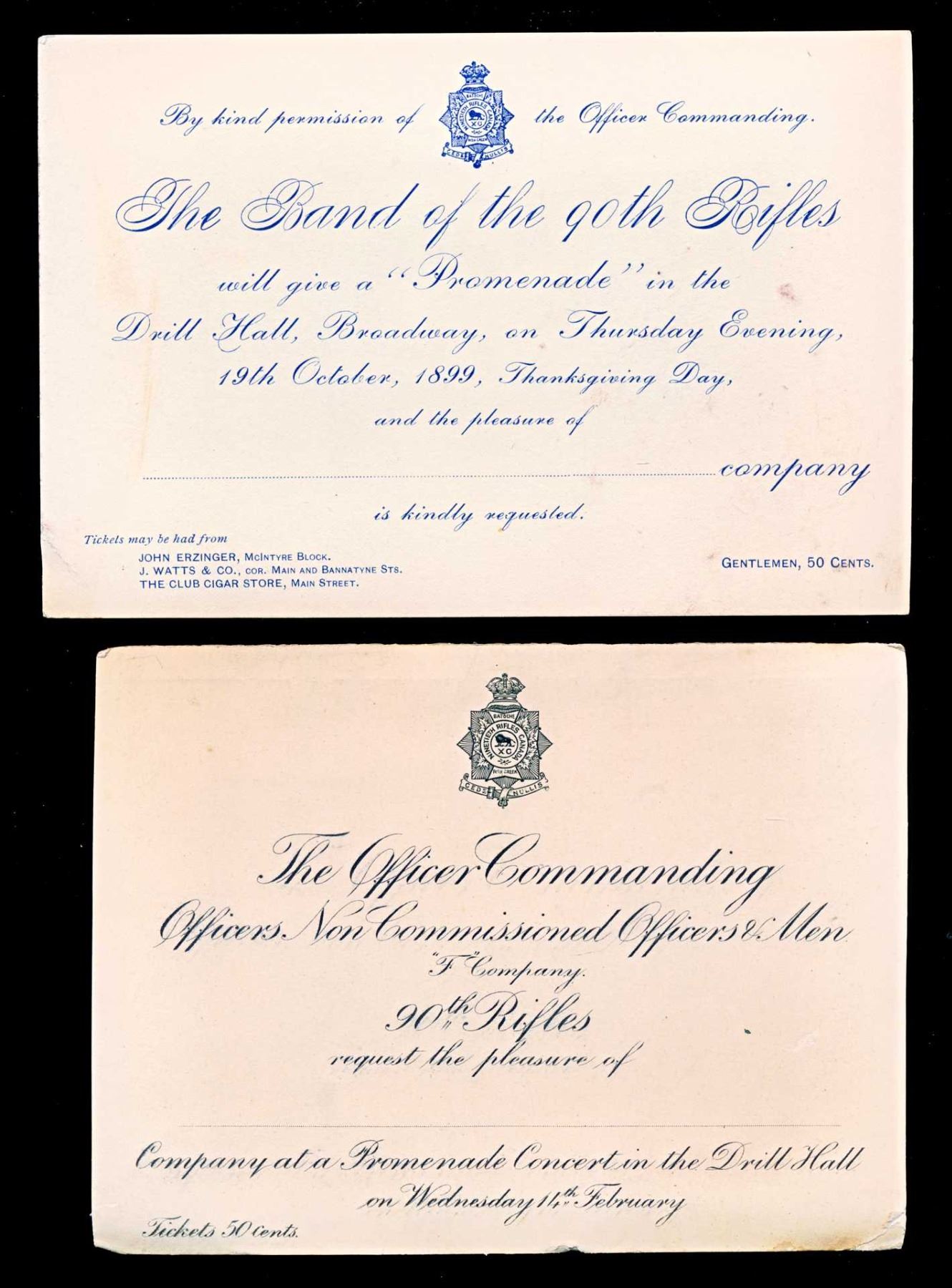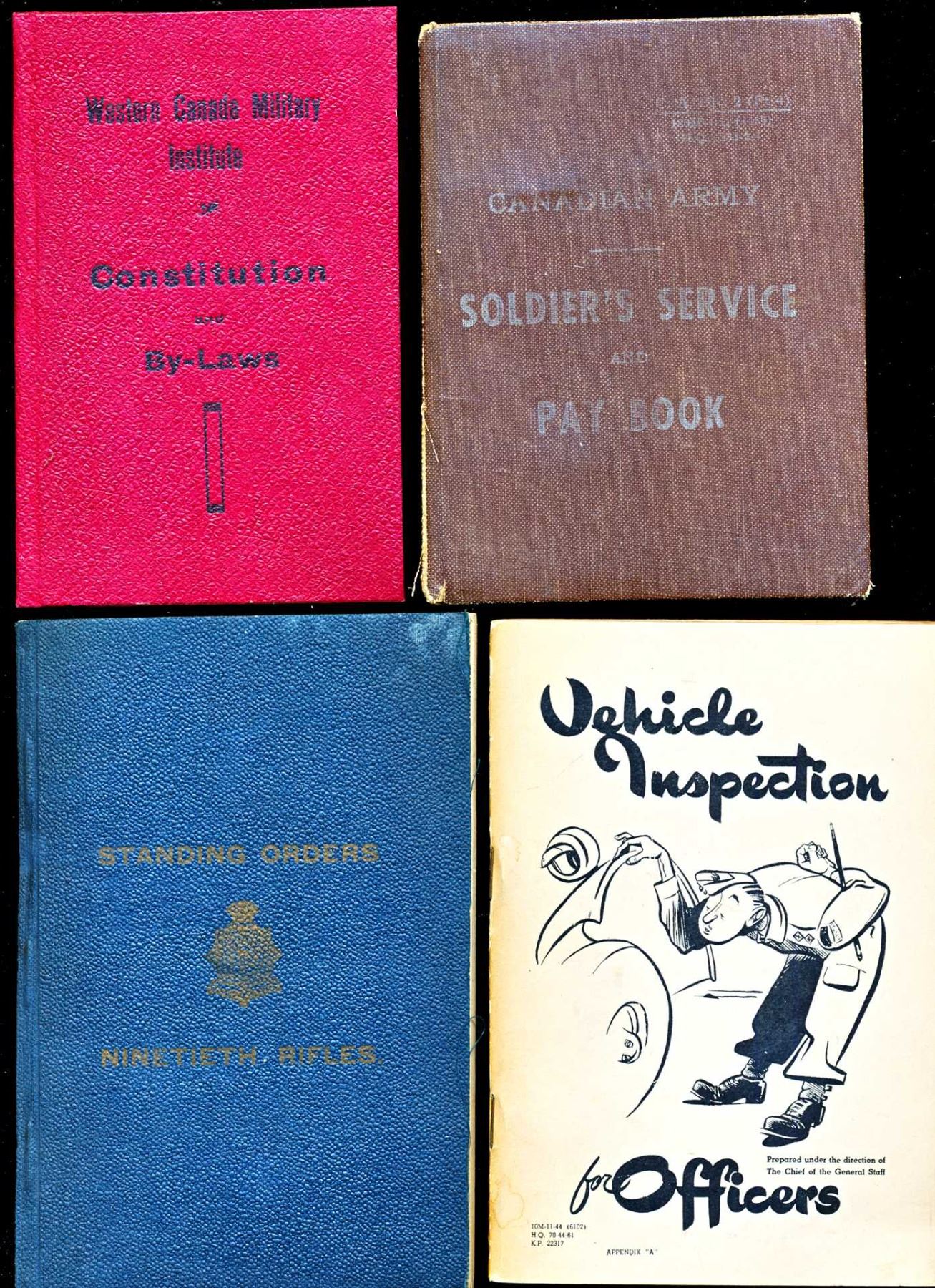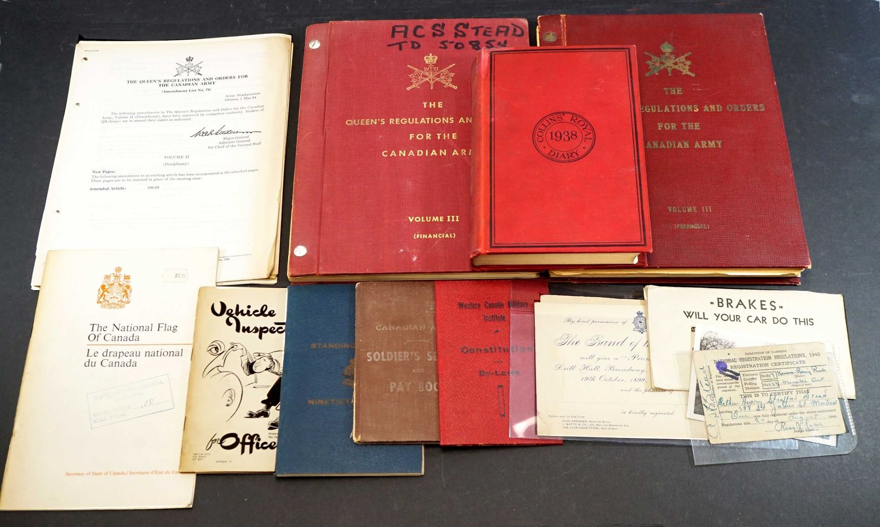 1899 Standing Orders of the 90th. Rifles, Winnipeg hard covered 155 x 105 mm. 60 page book EF, 2 1899 Invitation cards to 90th. Rifles events EF RRR, Constitution & By-Laws of the Western Canada Military Institute 8 page hard cover EF RRR, 1938 Collin's Royal Diary (some inscriptions) hard covered Used, 1940 registration card and Service/Pay book (several entries), an undated B&W photo, 1944 Vehicle Inspection for Officers manual EF, a 30 page booklet on vehicle regulations (missing cover and first page, dog eared and well used) Used, 1958 a 2 volume Queen's Regulations and Orders for the Canadian Army Volume III (financial) maual with 6 additional amendments. and a 1966 National Flag of Canada booklrt by Queen's Printers cat. N. S2-1866 EF.