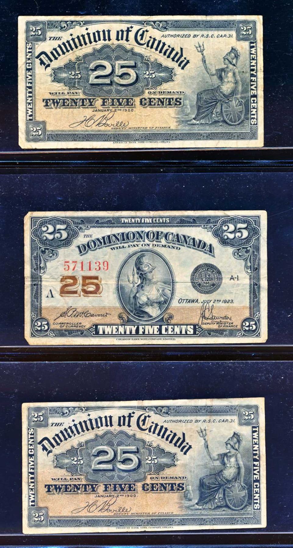 3 x 1900 25 Cents BC-15b(1 x AG & 2 X F.), 1 x 1923 25 Cents DC-24c S/N 571139 F, 1 x 1954 Mod. $2.00 BC-38d S/N P/G0792363 AU, 1 x 1967 $1.00 BC-45b S/N R/O4730111 fp 3 bp 7 F, 10 x 1973 BC-46a (several pairs of sequential numbers) Unc and 2 x 1974 $2.00 BC-47 S/N BF1674304 & 306 Unc.