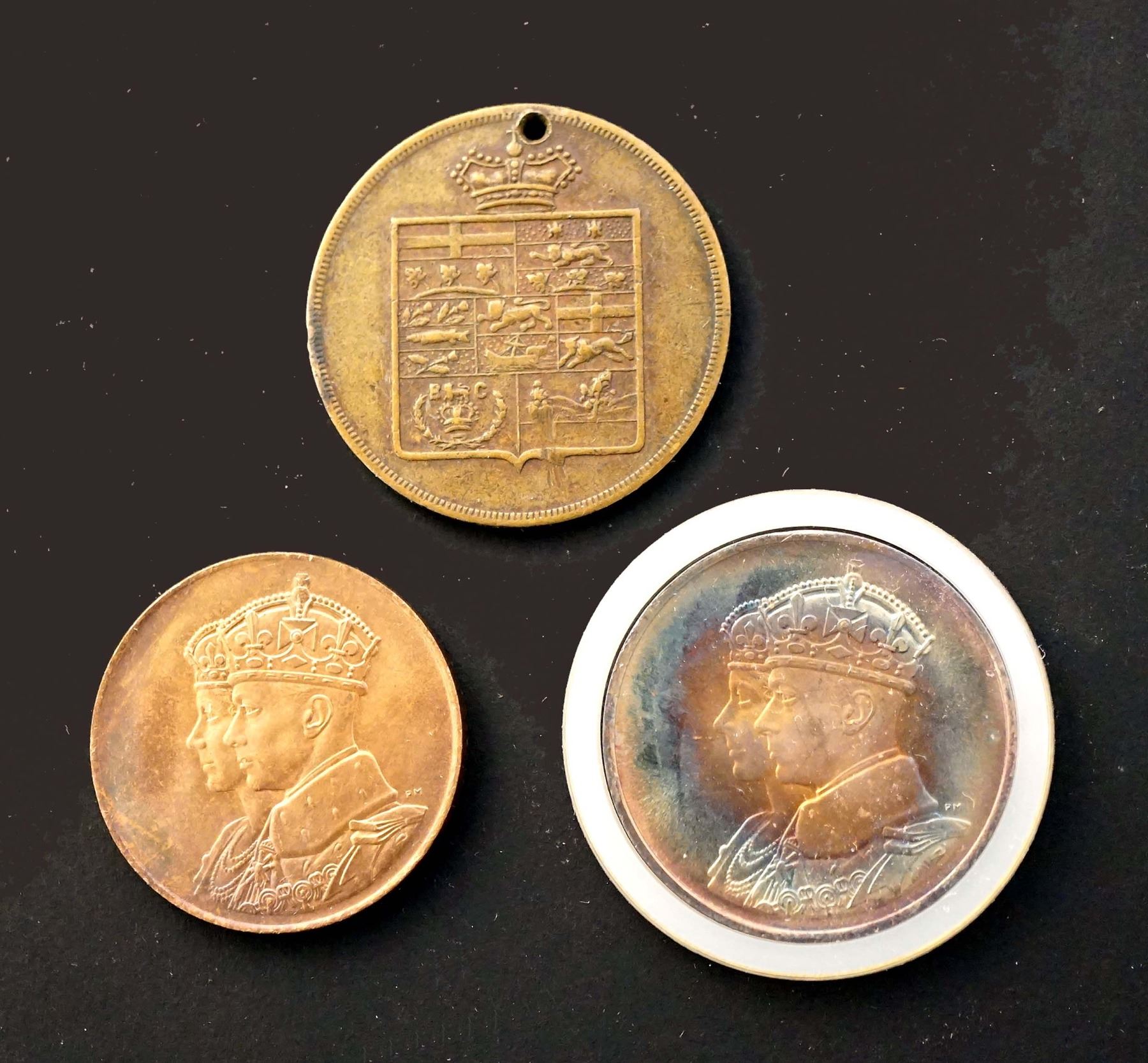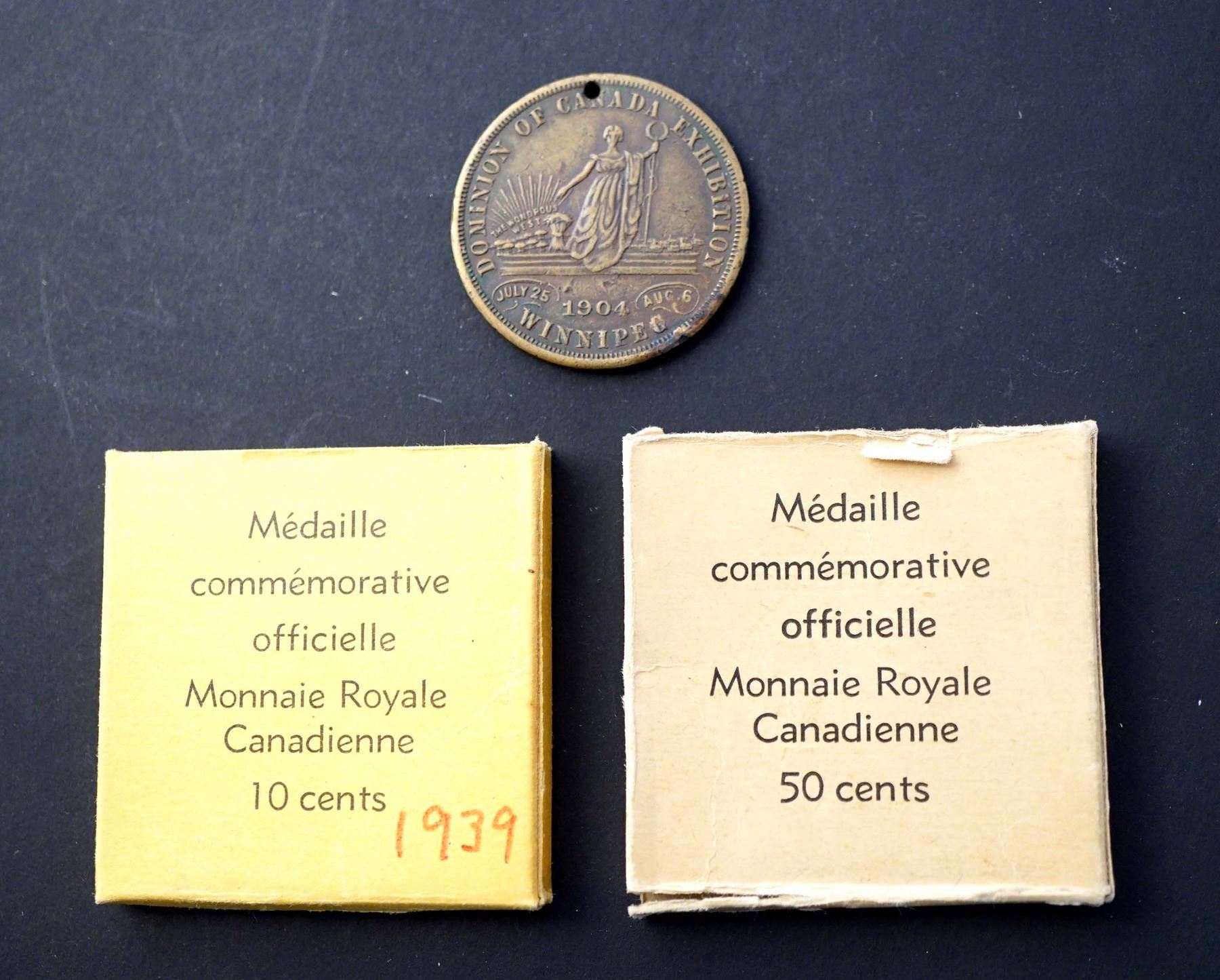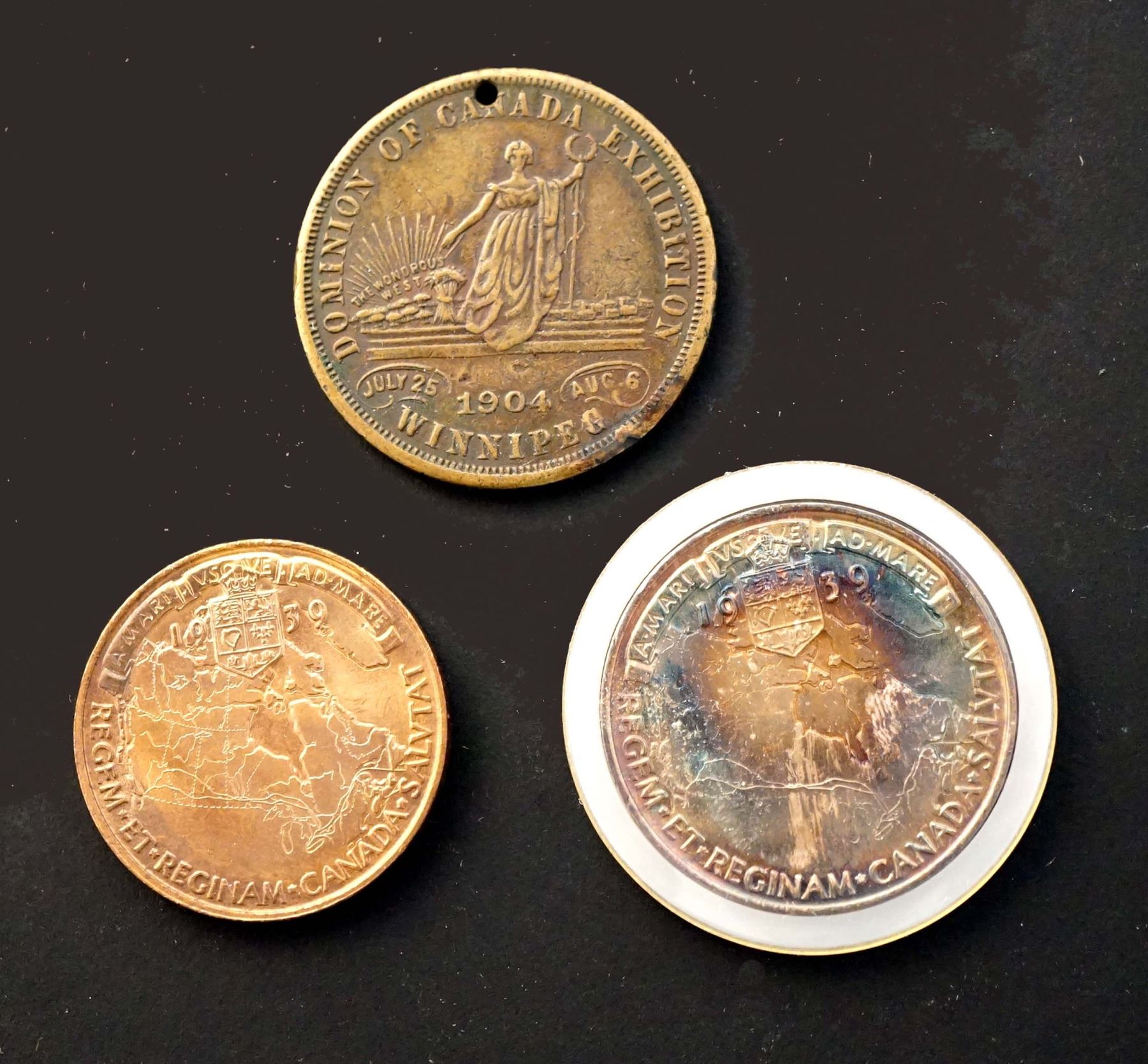 1904 A very rare Winnipeg Exhibition medal in Very Fine AE-35 15.0 gms. Edge: Plain. The medal is pierced as it was issued with a hanger and ribbon. 1939 A pair of Royal Visit medals 31 mm. Silver and Copper both in mint condition with original boxes. Outstanding patina on the silver issue. Should be viewed.