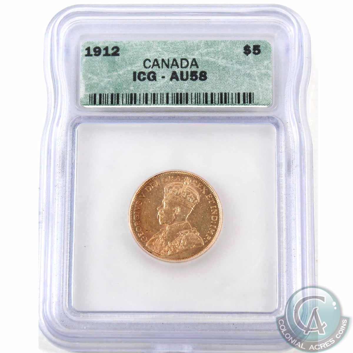 CANADA 1912 $5 Gold ICG Certified AU-58. This coin is 90% Pure and contains 0.242 oz of Pure Gold. Please review scan for opinion of Grade.