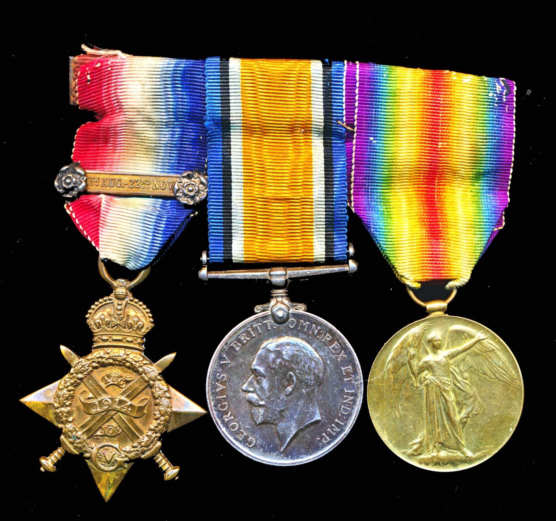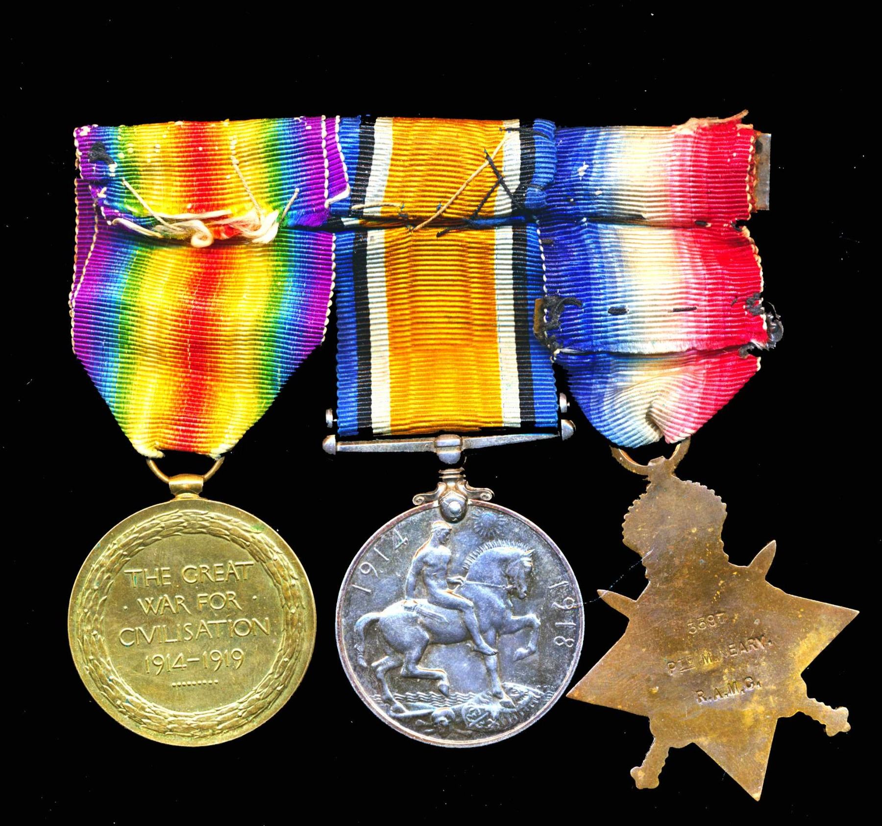 Named to 3397 Pte. M. Neary R.A.M.C.consisting of 1914 Star w/5th AUG.-22nd 1914 w/2 silver rosettes sown over the bar, 1914-1920 War Medal and 1919 Victory Medal. all on a mounting bar.
