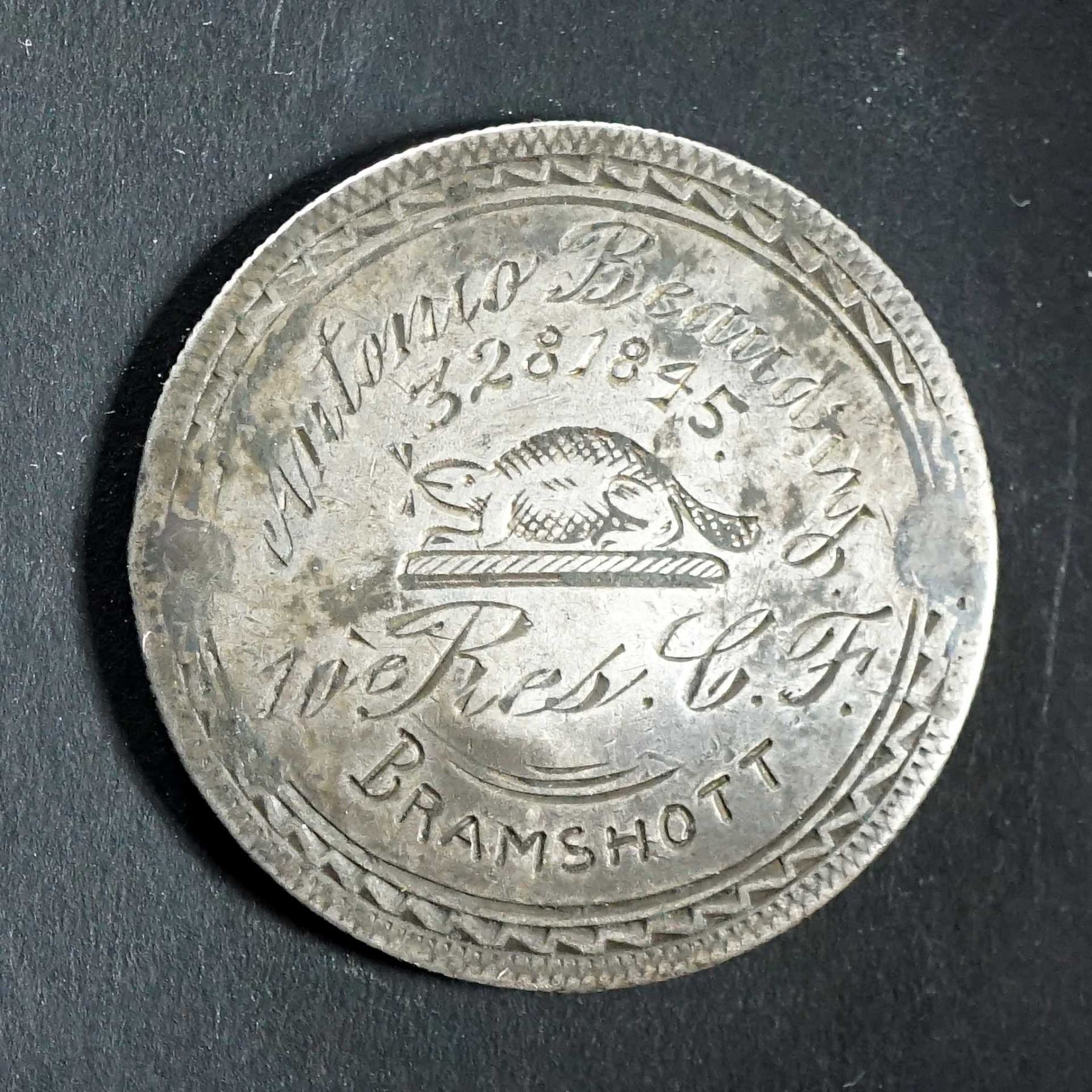 British 1/2 Crown inscribed with "Antonio Beaudry, 3281845 10e.C.F.Bramshott". Born:May 15, 1896. Enlisted May 31, 1918 and Discharged July4, 1919. The piece was done while training at Bramshott Military Camp.Pin attachments removed.