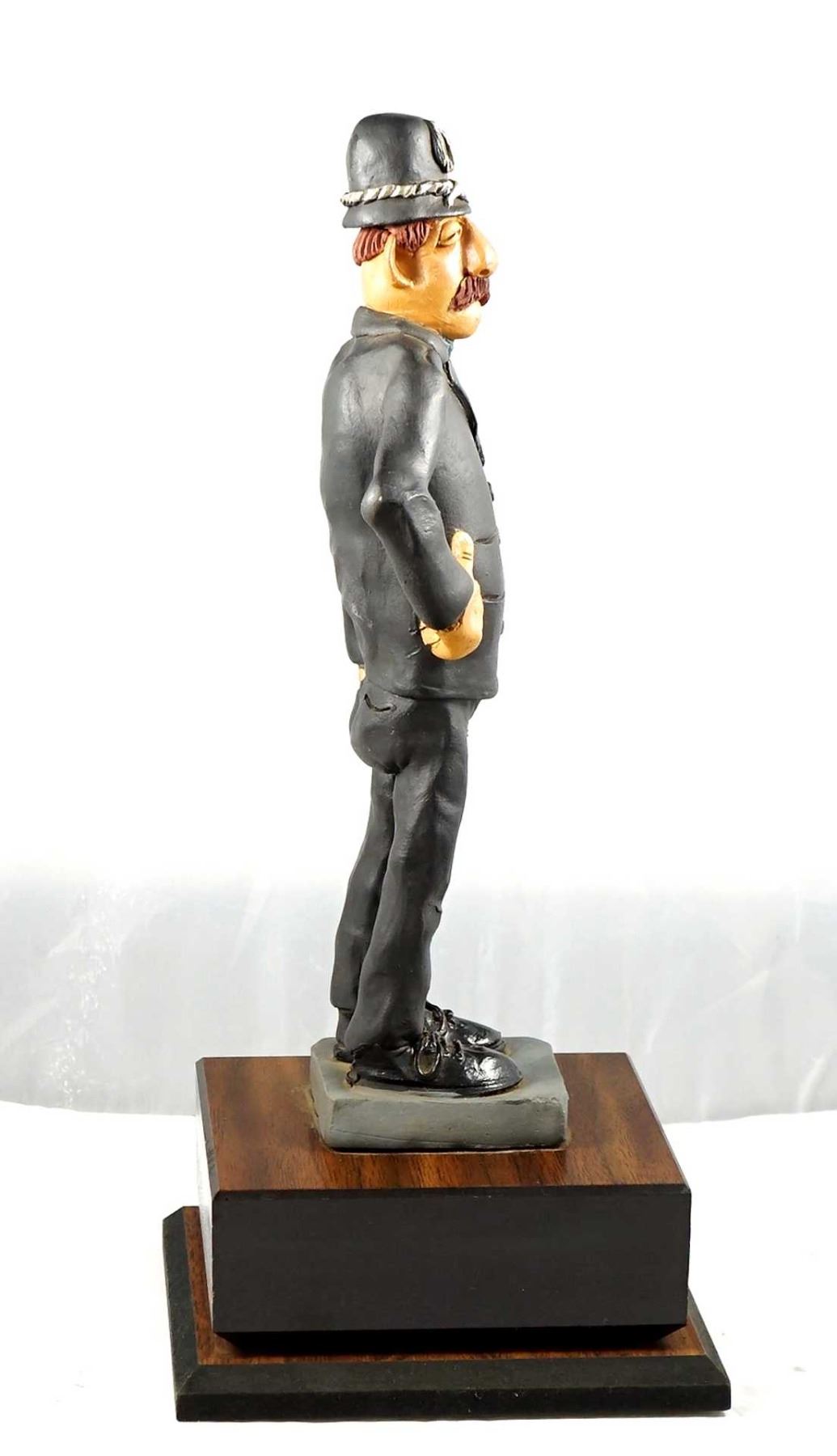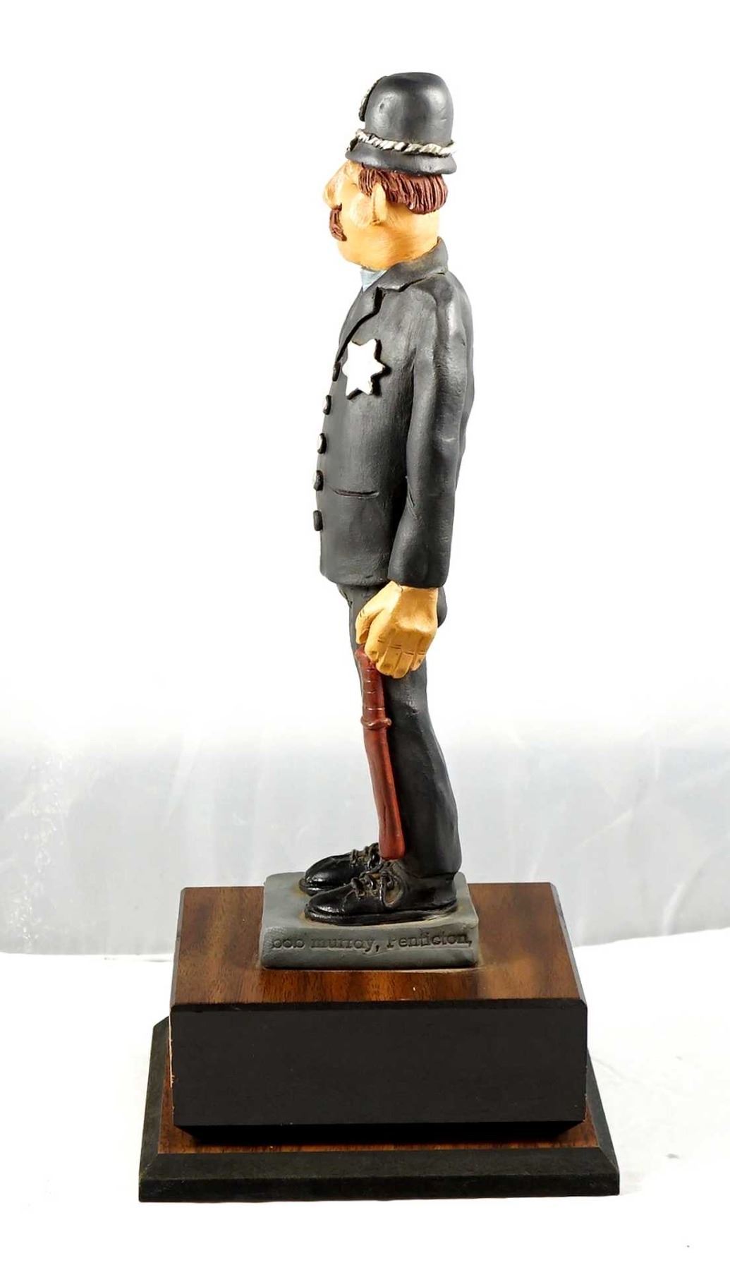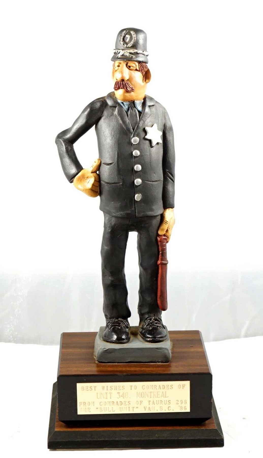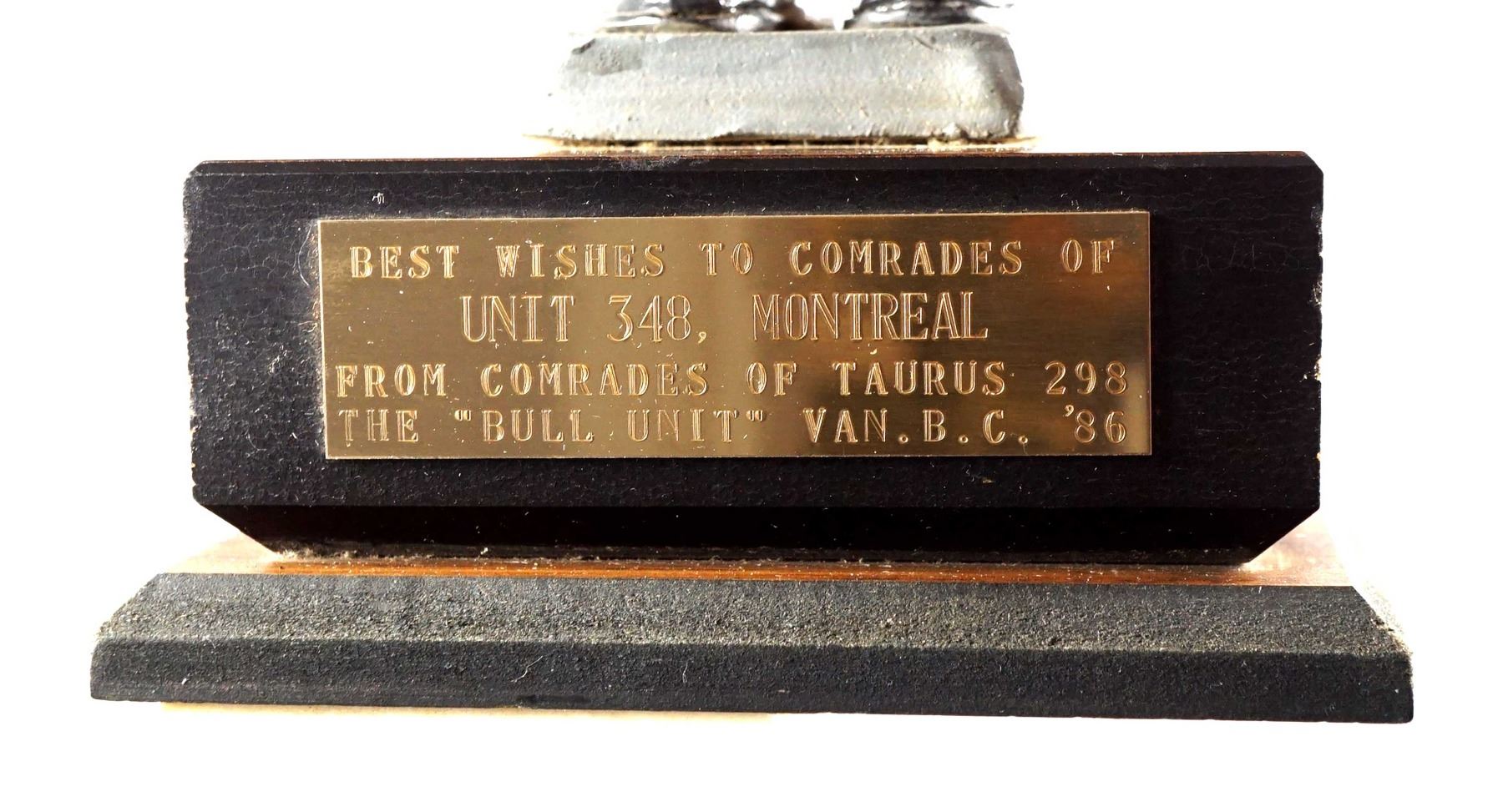 A rare cast 49 mm. challenge coin of the 438 Squadron "Wild Cats" Helicoper group in antique brass. Accompanied by a 27 inch comical statue of a British bobby mounted on a wood block with a brass plaque commemorating "BEST WISHES TO COMRADES OF UNIT 348 MONTREAL FROM COMRADES OF TAURUS 298 THE BULL UNIT VAN. B.C. '86"