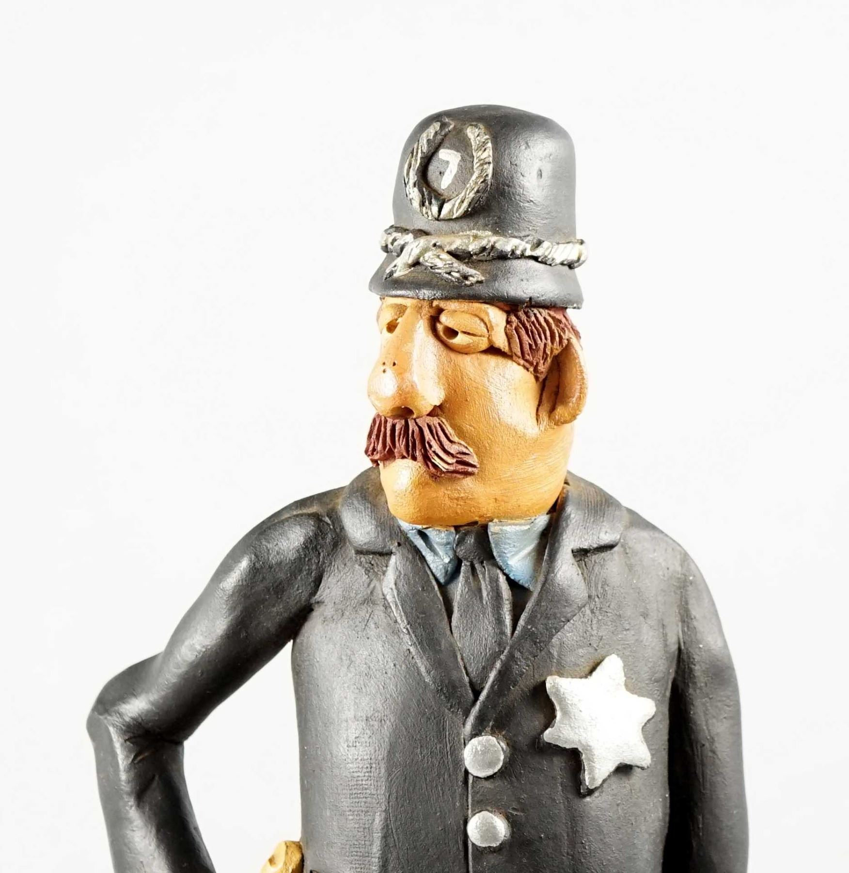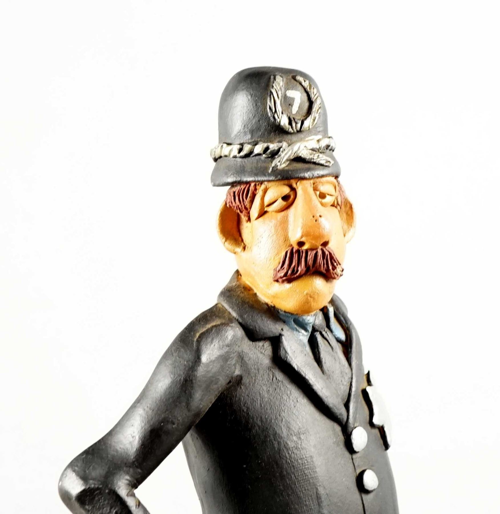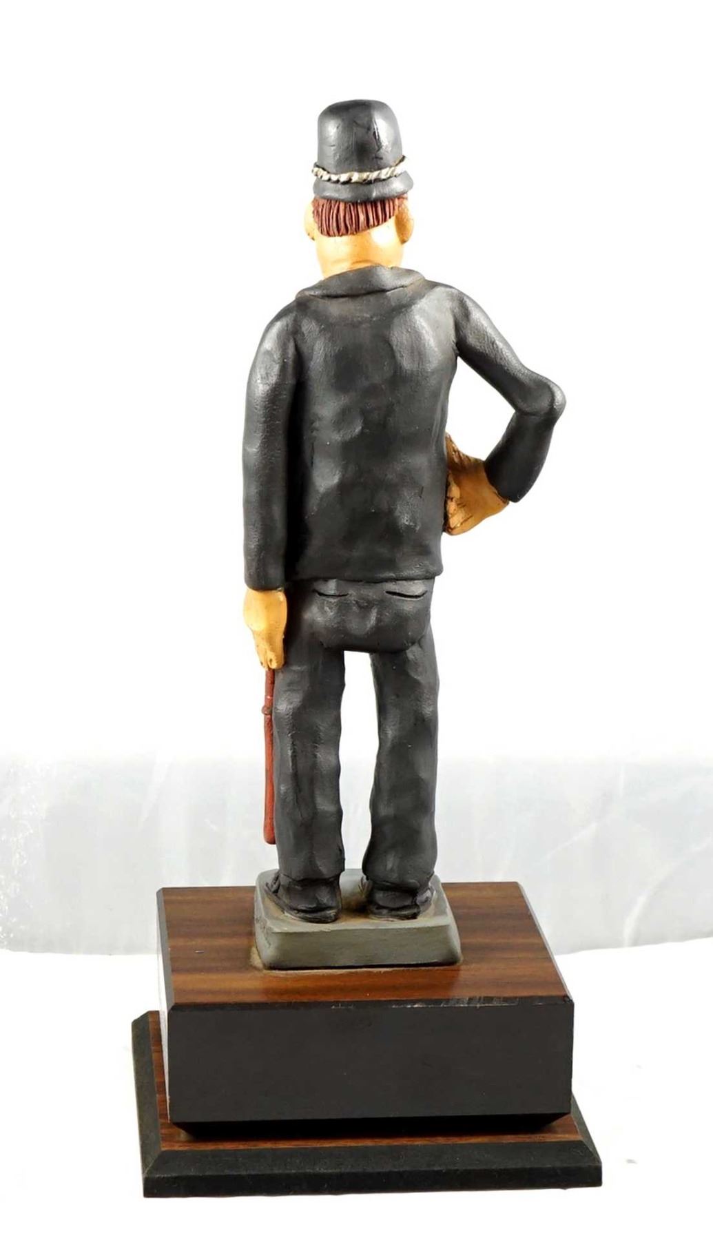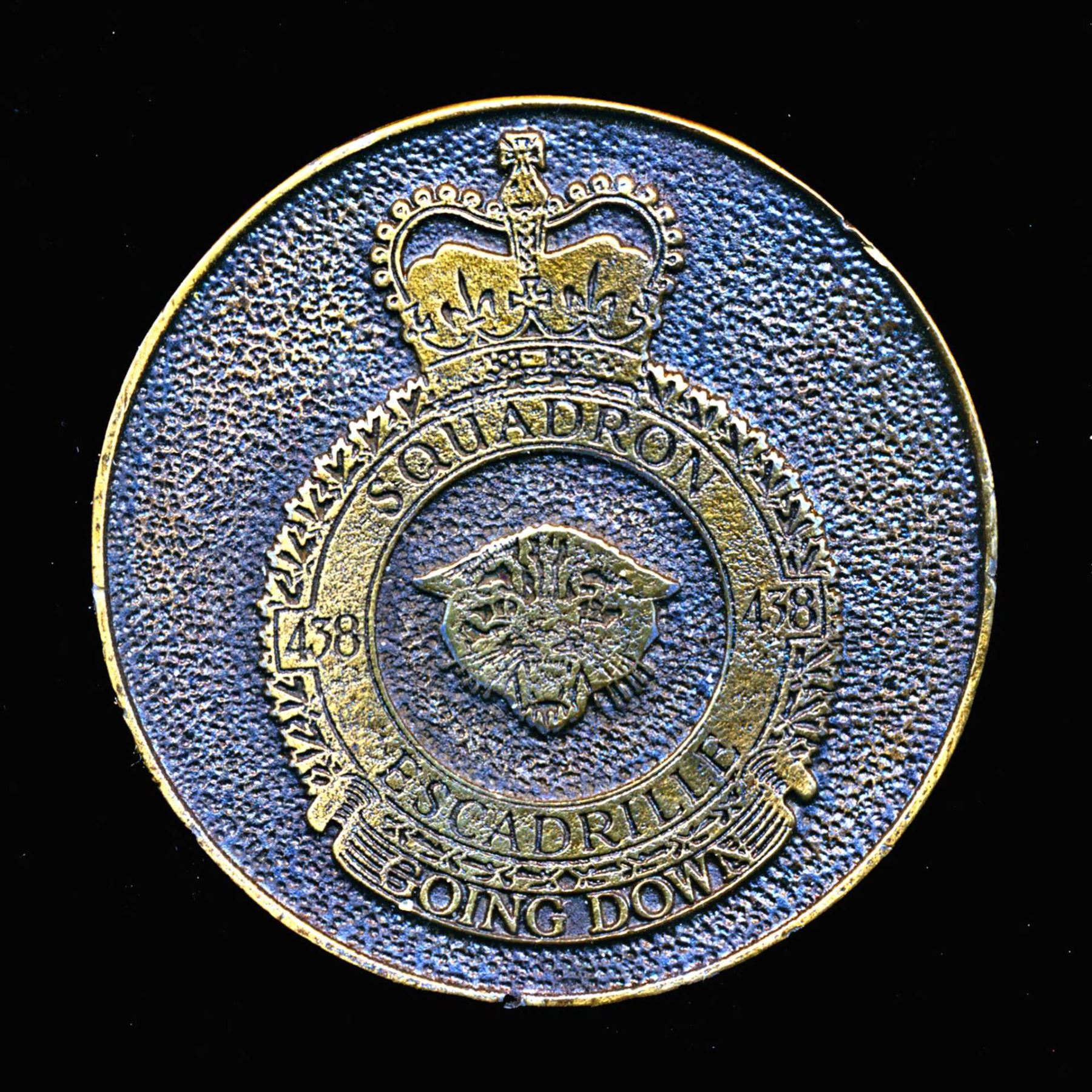 A rare cast 49 mm. challenge coin of the 438 Squadron "Wild Cats" Helicoper group in antique brass. Accompanied by a 27 inch comical statue of a British bobby mounted on a wood block with a brass plaque commemorating "BEST WISHES TO COMRADES OF UNIT 348 MONTREAL FROM COMRADES OF TAURUS 298 THE BULL UNIT VAN. B.C. '86"