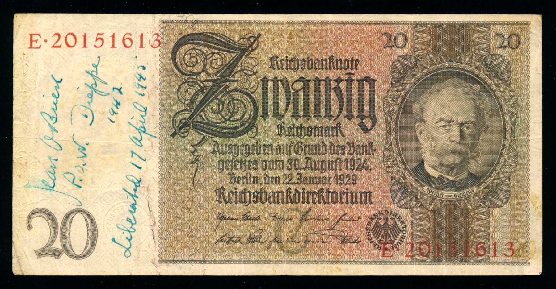 Signed while in Europe on P-181a 22.1.1929 20 Reichsmark, the diary of the signator is on The Pegasus Archive site. Jean OBrien was with Les Fusiliers Mont-Royal Regiment #D61352, POW # 43082 at Stalag IX-C. Extremely interesting reading!