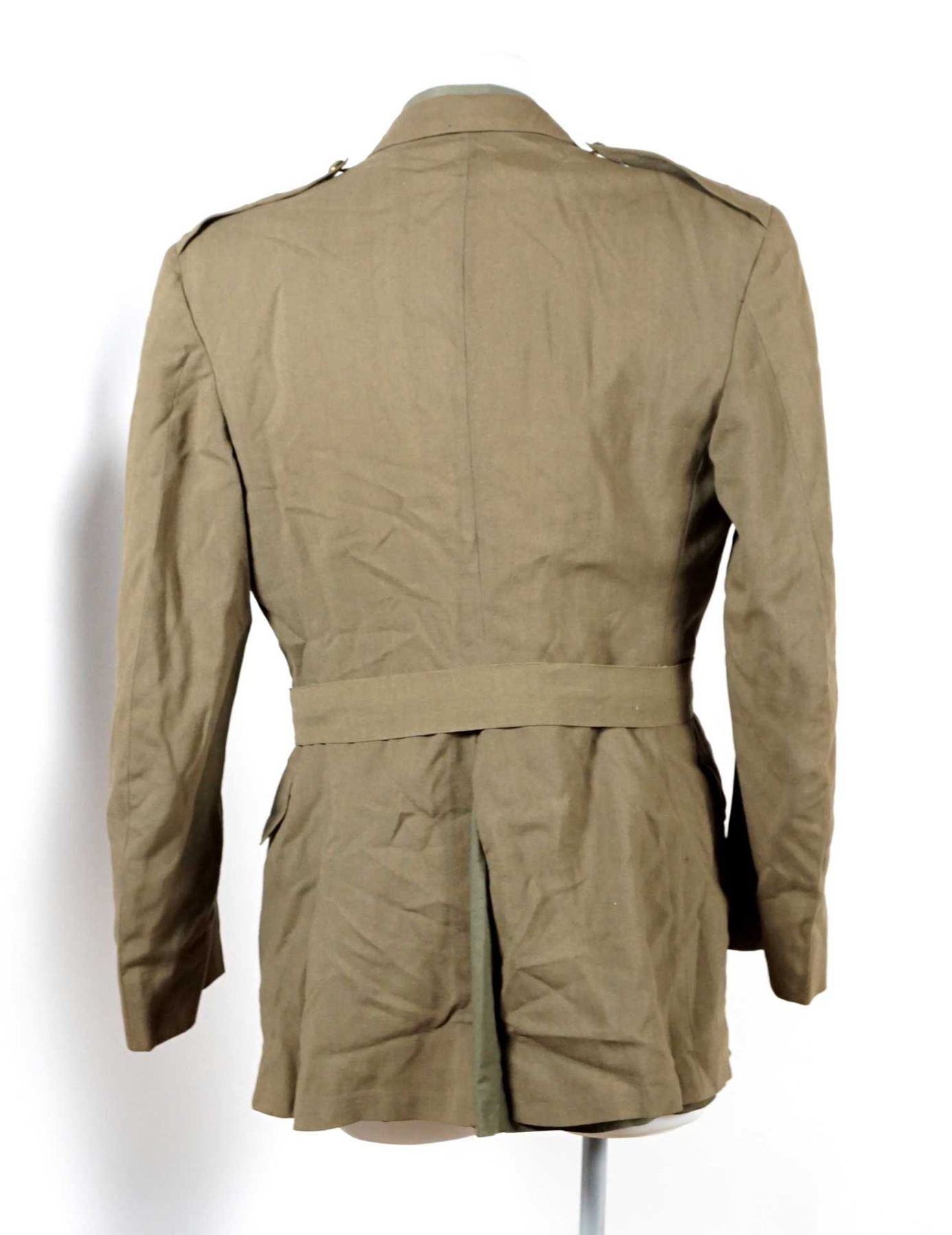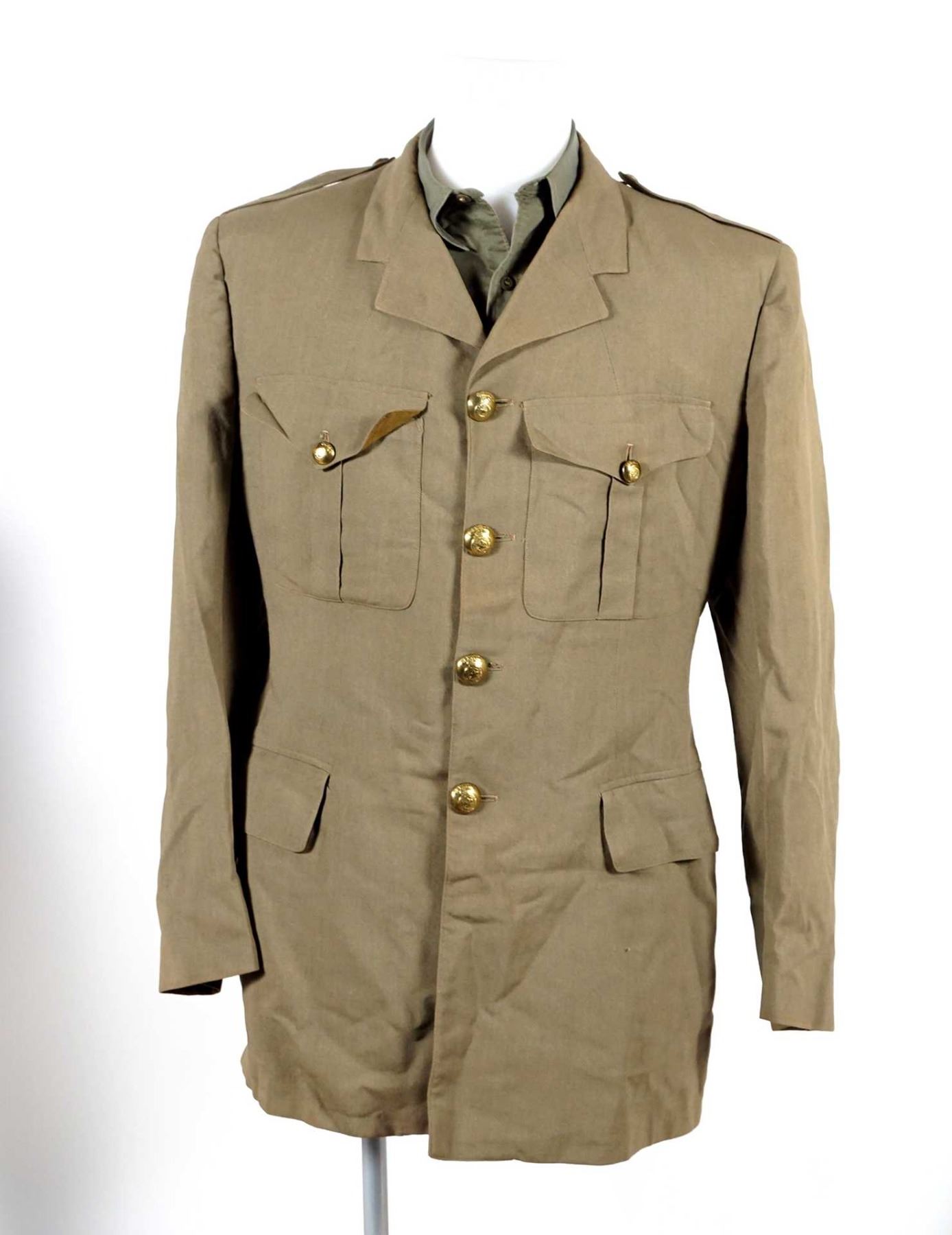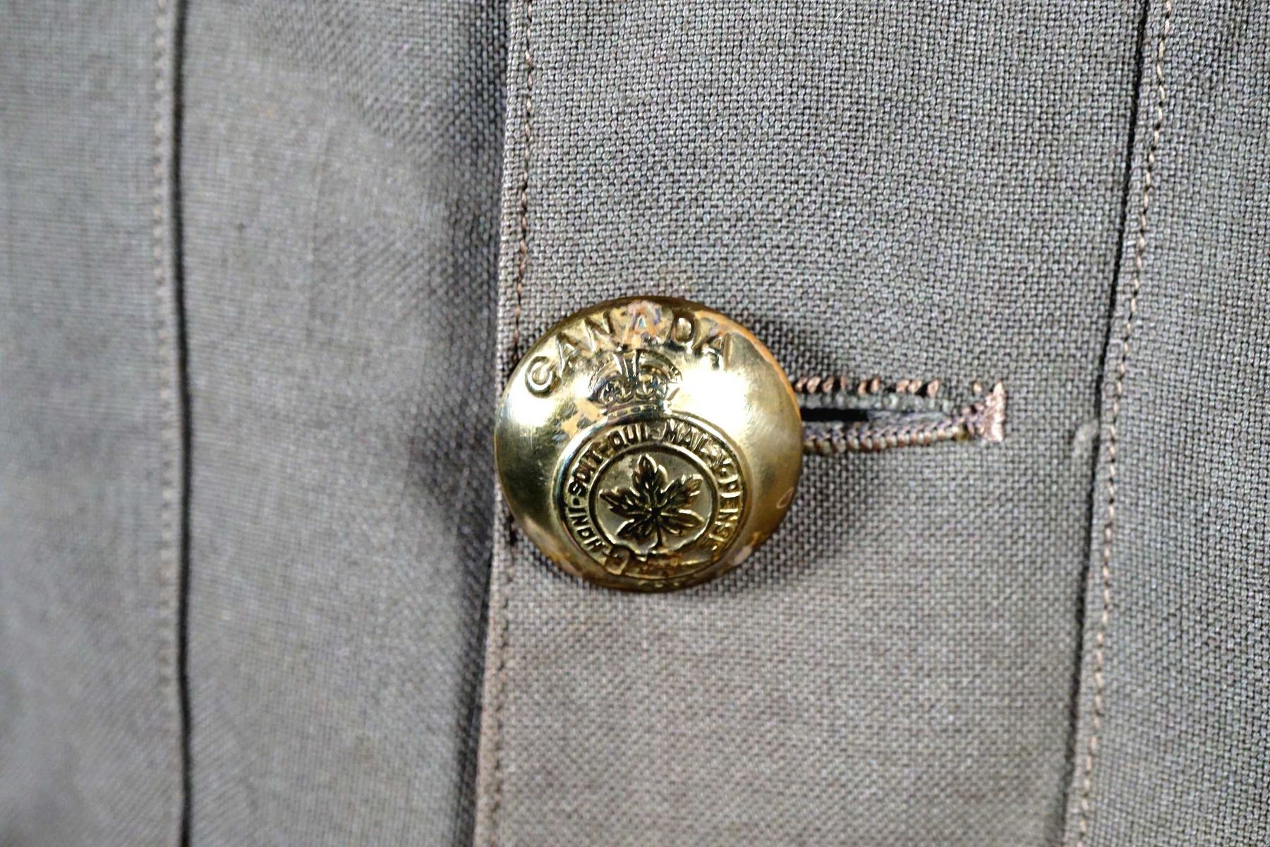 Jacket: #1 Tropical 1951 Size 17 (6'1"-6'2") Breast 42 by Strathcona Garment Manufacturers Co., comes with 6 x 27 mm. and 4 x 19 mm. brass buttons by United-Carr. Trousers: Summer 1952 Size 15 (5'11-6') Waist 37 by Major Craft Uniform Co. with unmarked light green shirt.