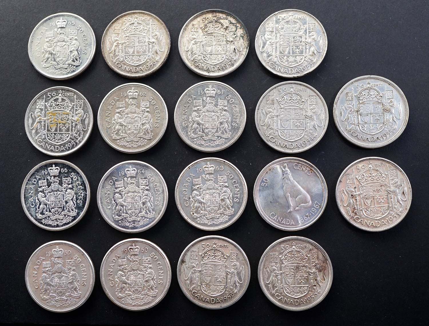 CANADA 1953-1967. Lot of 18 Elizabeth II Half Dollars Fine-UNC