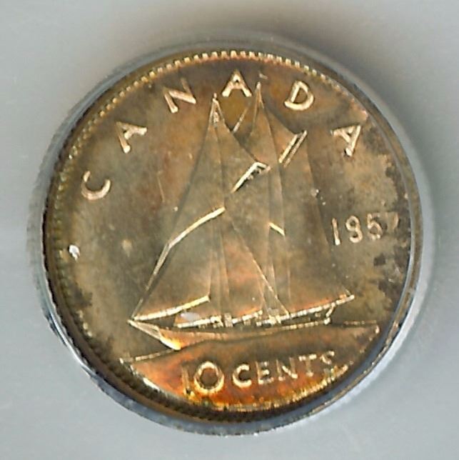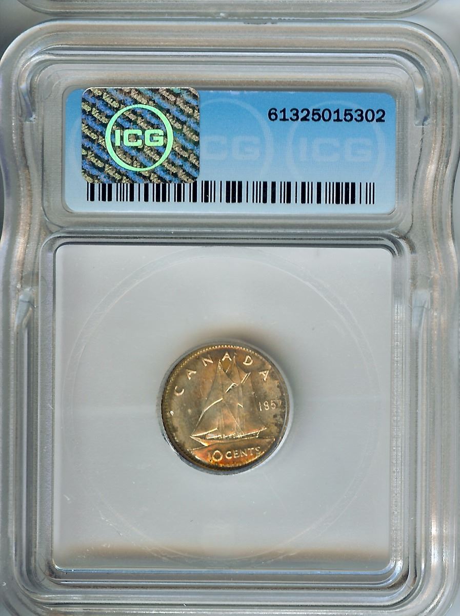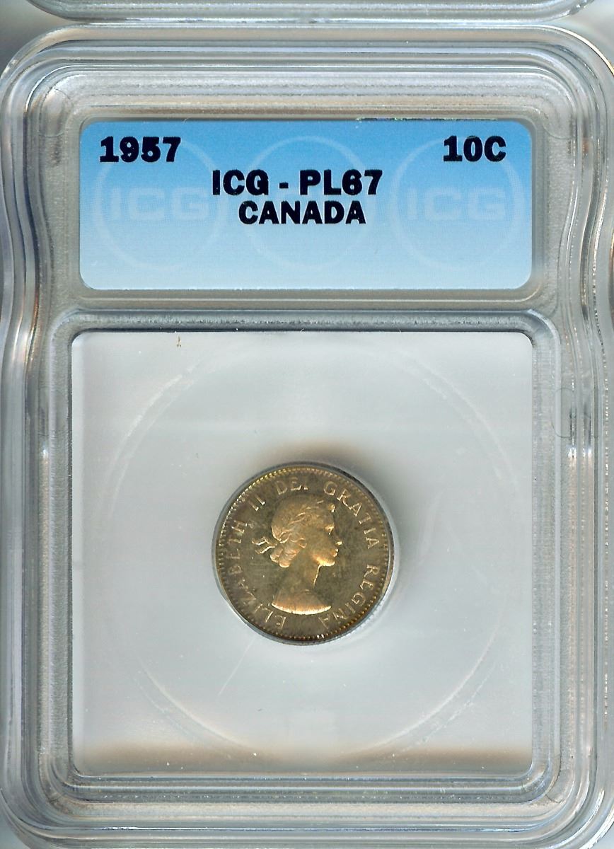 CANADA 1957 SILVER 10 CENTS ICG PL67