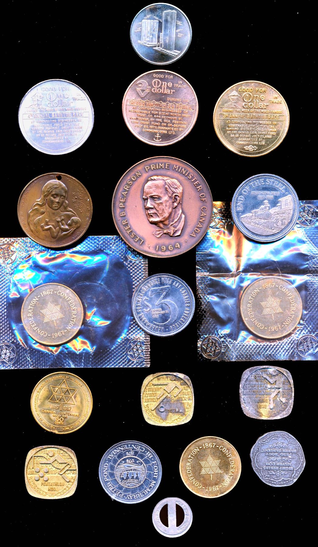 1964 Lester B.Pearson Canada Flag Medal 52 mm. 65.29 gms. Edge #1257 (has plastic foam residue on the edge) FDC, 5 x 1967 32 mm Confederation medal Unc, 3 Vancouver Sea Festival tokens, Ford Key Tag ID FZ087, 1975 Klondike token "end of the steel", 1 Cob token, 3 x 1976 Pictou medals, 1978 Peter Pond Token, 1982 $3.00 Courier 33 mm Token, undated Mother and child AE-39 medal pierced and 1984 Sun Life Centre medal in original sleeve and holder.