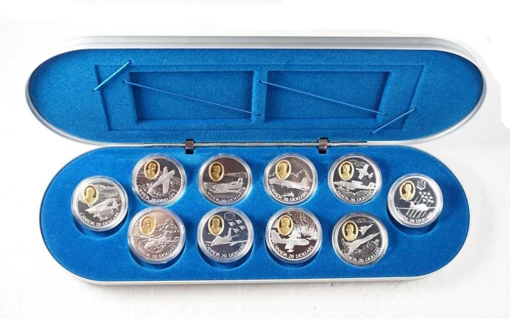 Serie incluant 10 monnaies de $20 en argent sterling, totalisant un poids de 311.04 grammes, ASW 9.25 oz. Avec boite et papiers.
