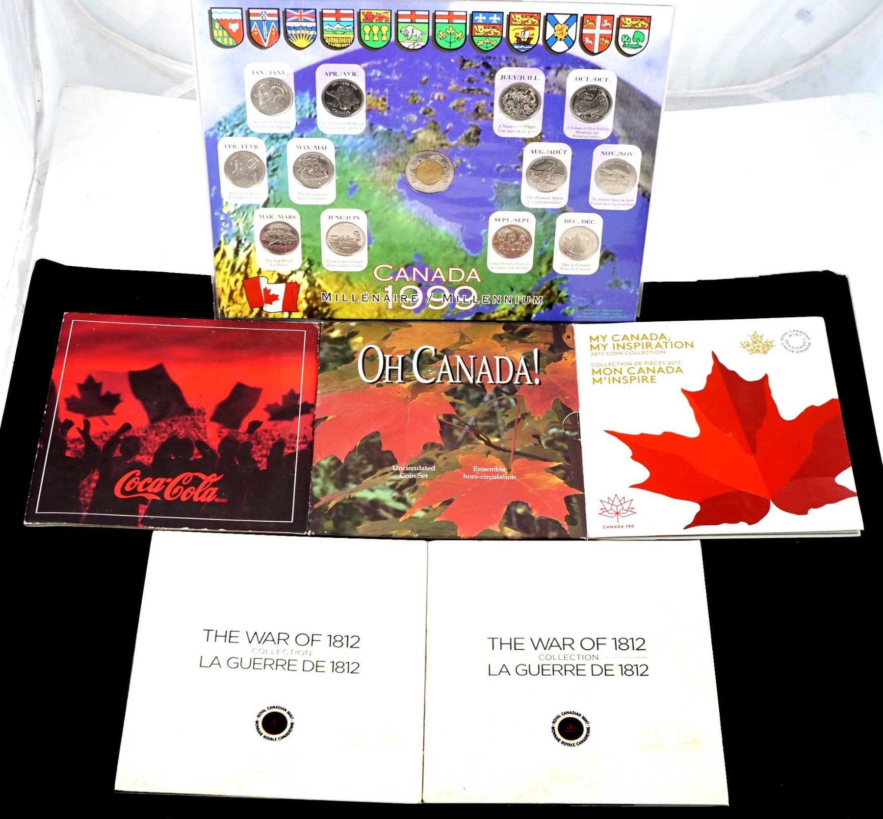 1997 Oh Canada Unc Set, 1999 Grand-mere, Quebec Custom Nunavut and Provincial Quarter set, 2 x 2012 War of 1812 Twoonie & 8 Quarter sers, 1 x 2017 My Canada, My Insperation 7 coin year set.. All come in original packaging.