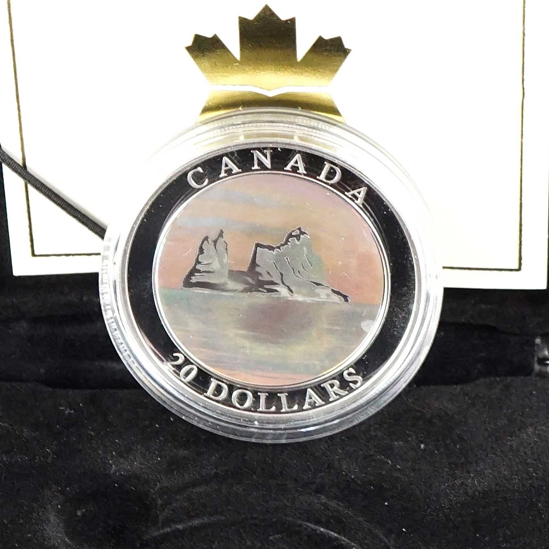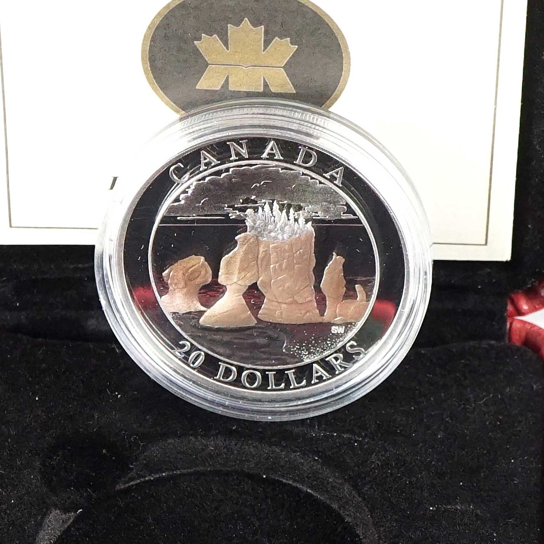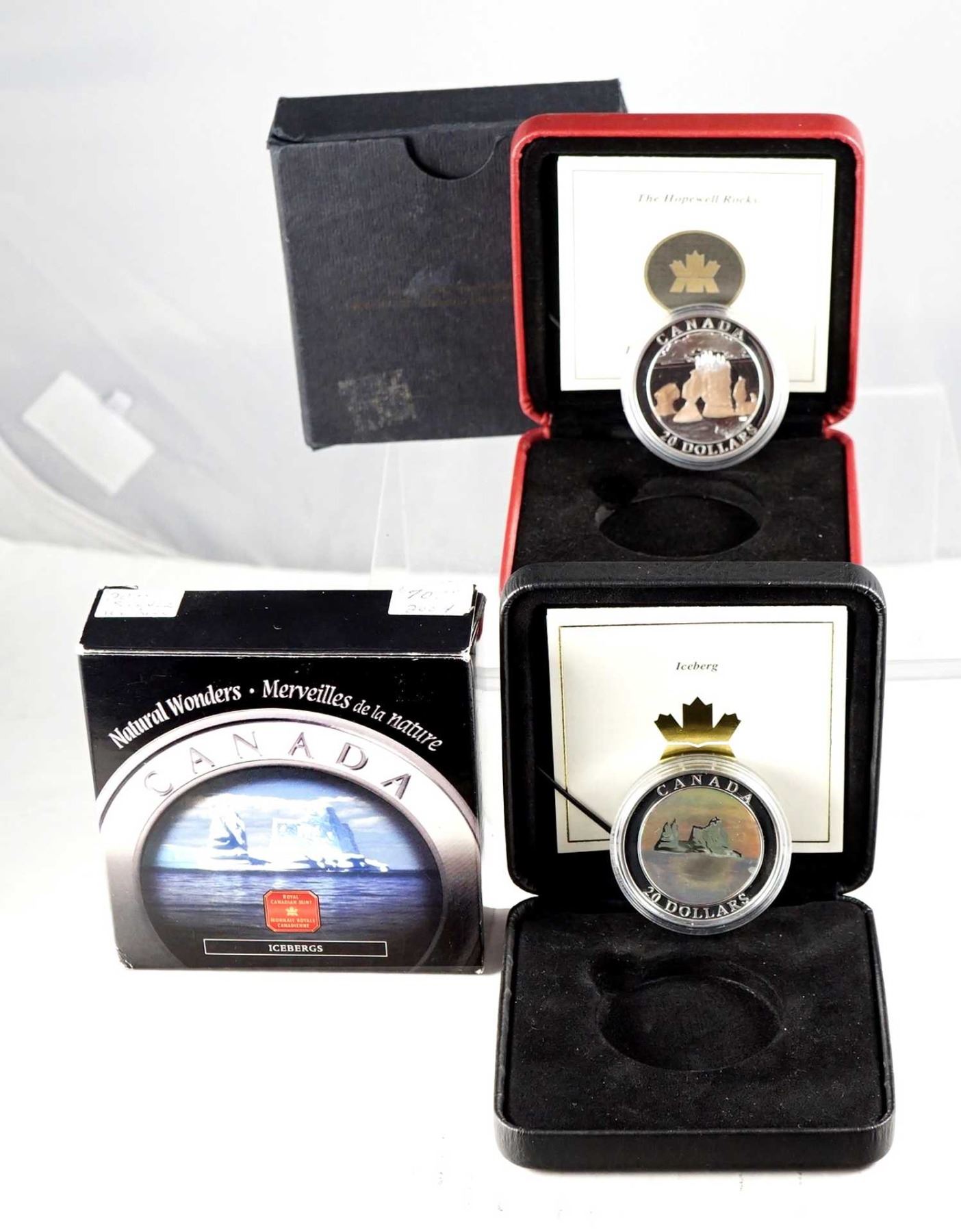 2.01 Oz.9999 silver 1 x Iceburgs holographic in black leatherette clam case, COA and beauty outer box with selectively gold plated Hopewell Rocks in a red leatherette clam case, COA and black outer box. Both coins are encapsulated.