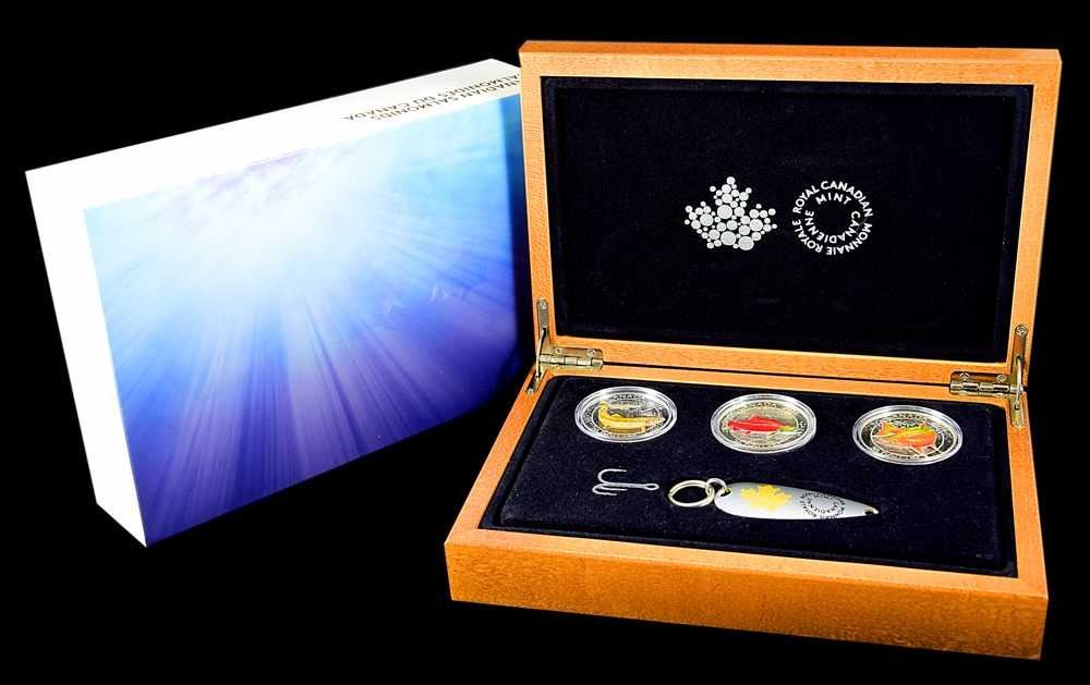 (L'omble chevalier, Le saumon rouge, Le saumon de l'Atlantique) Avec boite et papier, Argent 999 31,83 grammes chaque. ASW 3,06734 oz en tout.