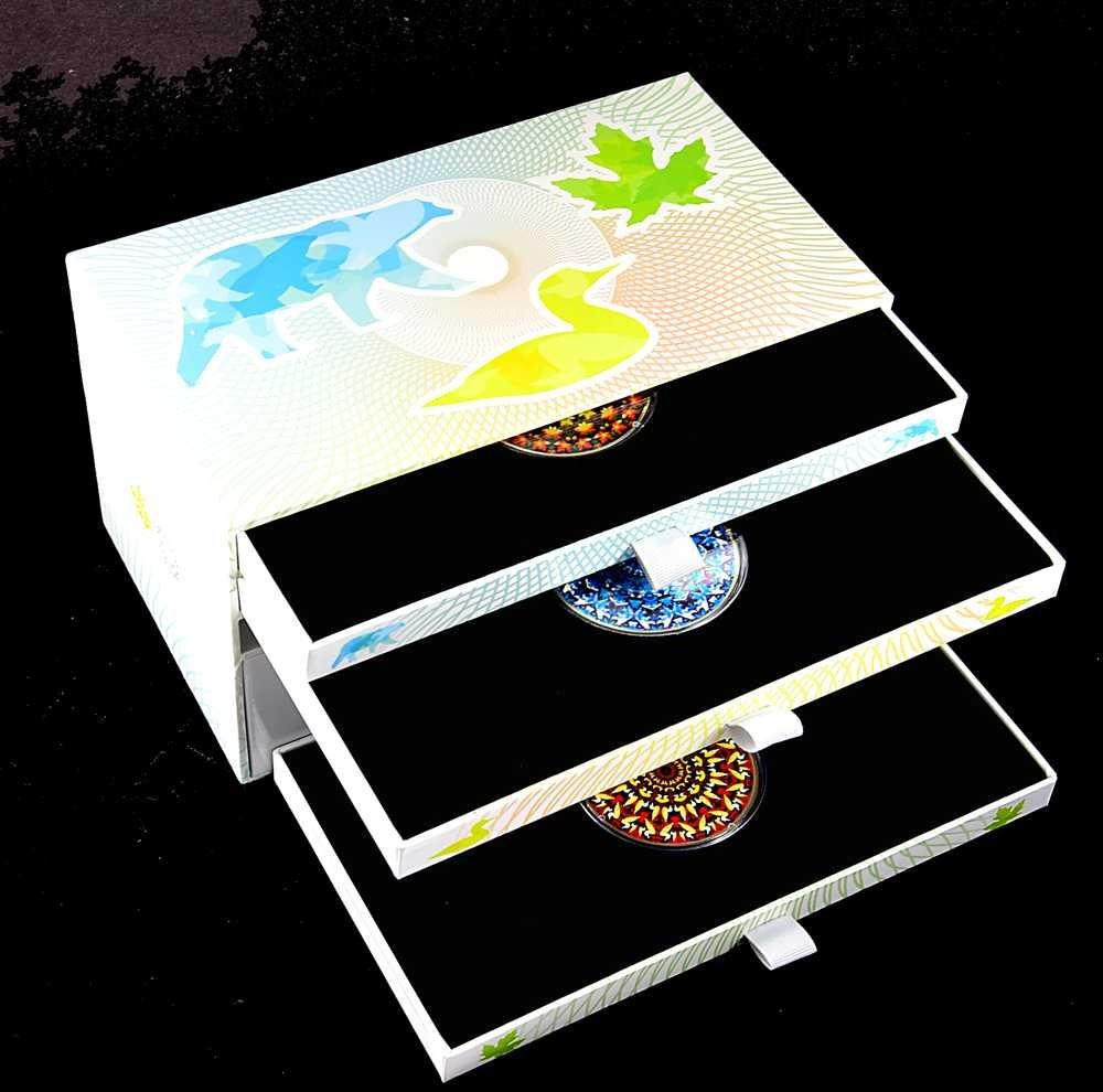 (La feuille d'erable, Le huard, L'ours polaire) Avec boite et papier, Argent 999 et 31,85 grammes chaque. ASW 3,06927 oz en tout
