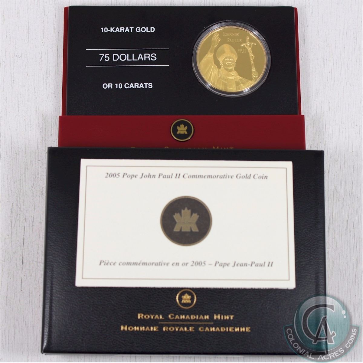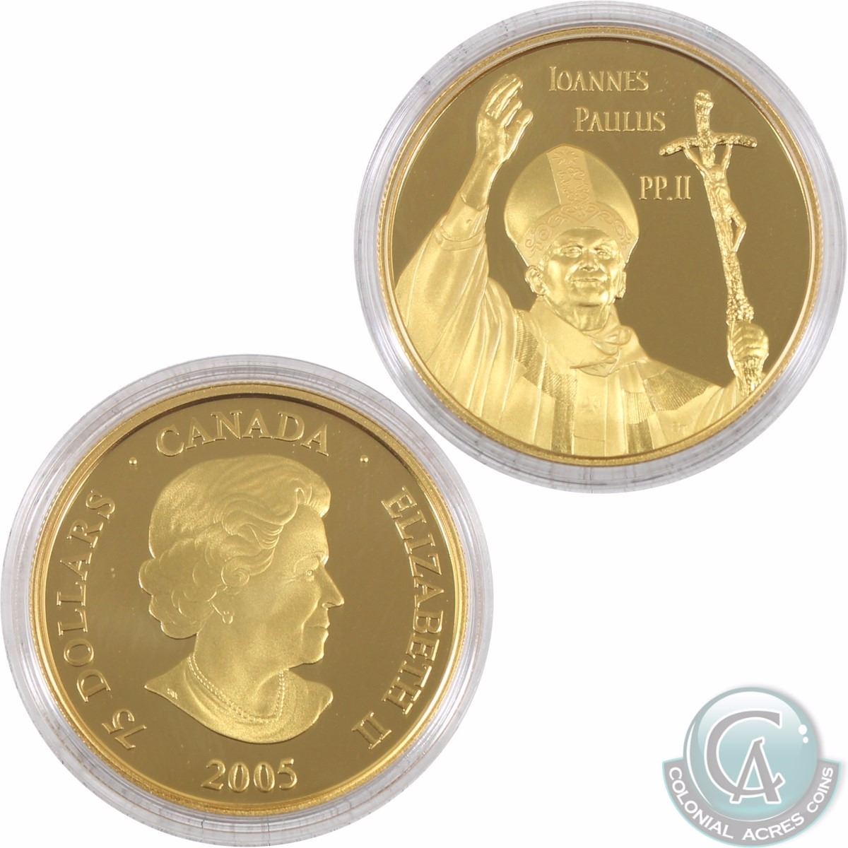 CANADA 2005 $75 Proof Gold, Pope John Paul II. This coin is 10K Gold and weighs 31.44 grams (.4211 oz Pure Gold). Coin comes with all original Mint Packaging.