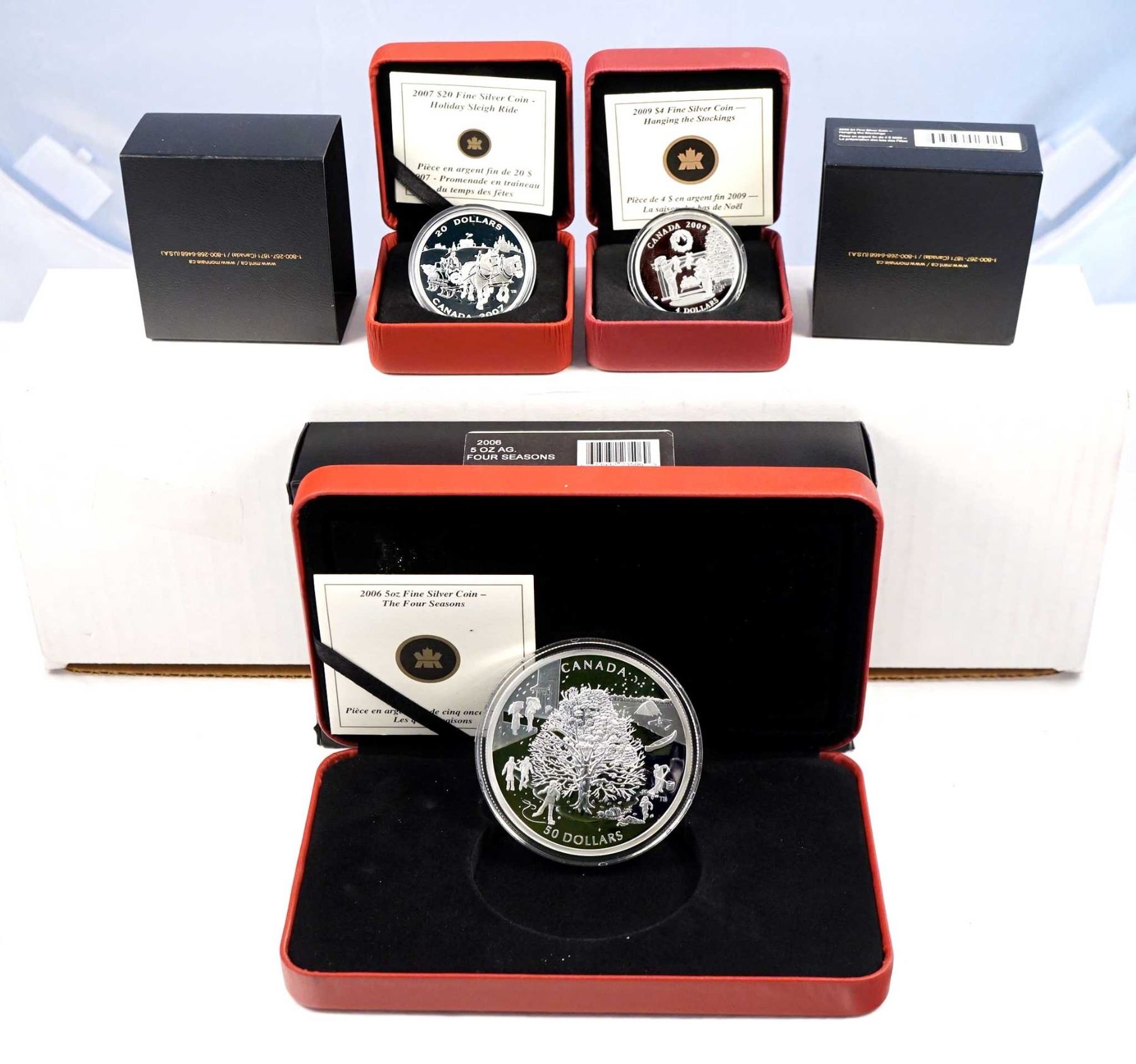 .9999 AG 1 2006 $50.00 Four Seasons 5.026 oz.,1 x 2007 $20.00 Holiday Sleigh Ride 1.01 oz. and 1 x 2009 $4.00 Hanging the Stockings .510 oz. All comes with COA's, cases and sleeves.