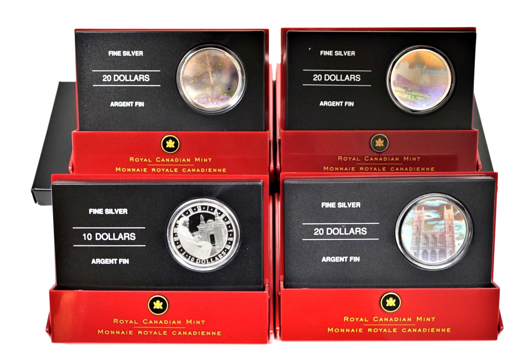 .9999 AG 1 x $10.00 Louisbourg .81 oz. with a set of 3 x $20.00 Hologram Canadian buildings 3.0 oz. All include case, COA and sleeve.