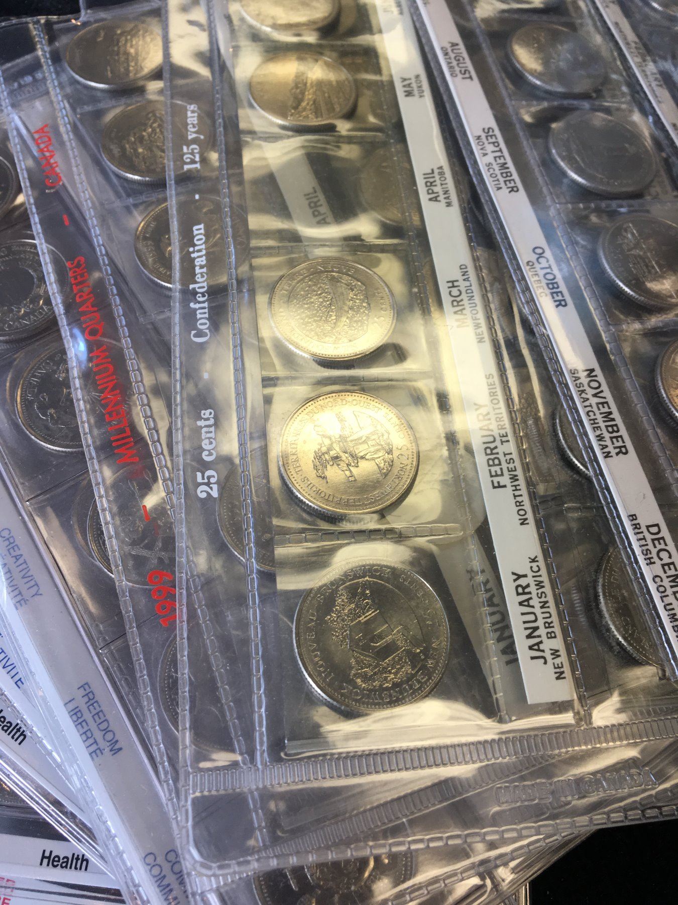NICE COLLECTION OF 9 CIRCULATION 25 CENTS SETS! IN THE PLSTIC PULL OUT SLEEVES.1992 1999 AND 2000 MILLENIUM SETS