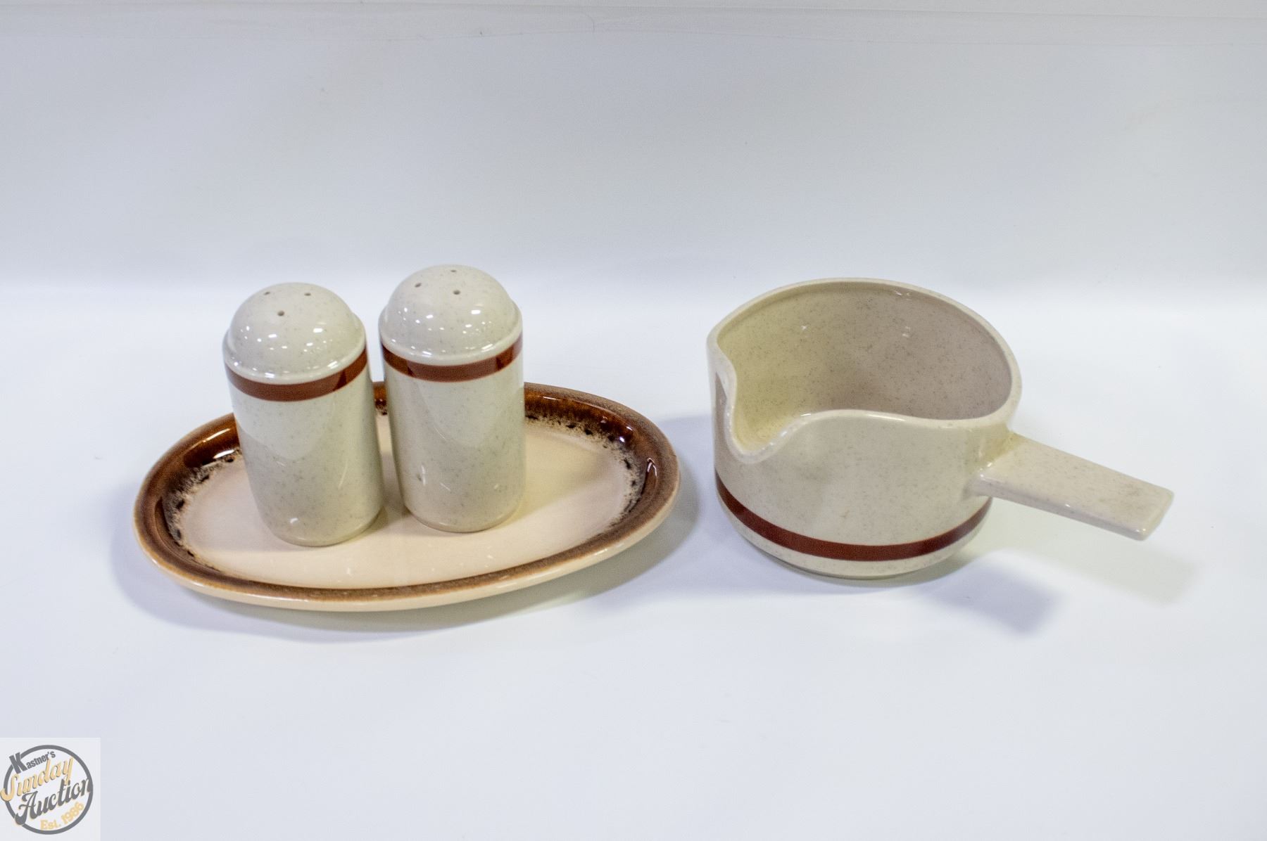 BY NORTHLAND STONEWARE GRES JAPAN HANDLED POURING DISH + S+P SHAKERS MATCHING SET **ALL ITEMS MUST BE REMOVED BY 5PM SATURDAY, APRIL 11TH 2026. ALL REMAINING ITEMS WILL BE SUBJECT TO A $6.00 PER DAY STORAGE CHARGE. ANY ITEMS REMAINING AFTER MONDAY, APRIL 27TH 2026 WILL BE CONSIDERED FORFEITED. NO REFUNDS WILL BE ISSUED FOR FORFEITED ITEMS. TO SCHEDULE A PICK UP APPOINTMENT CLICK HERE