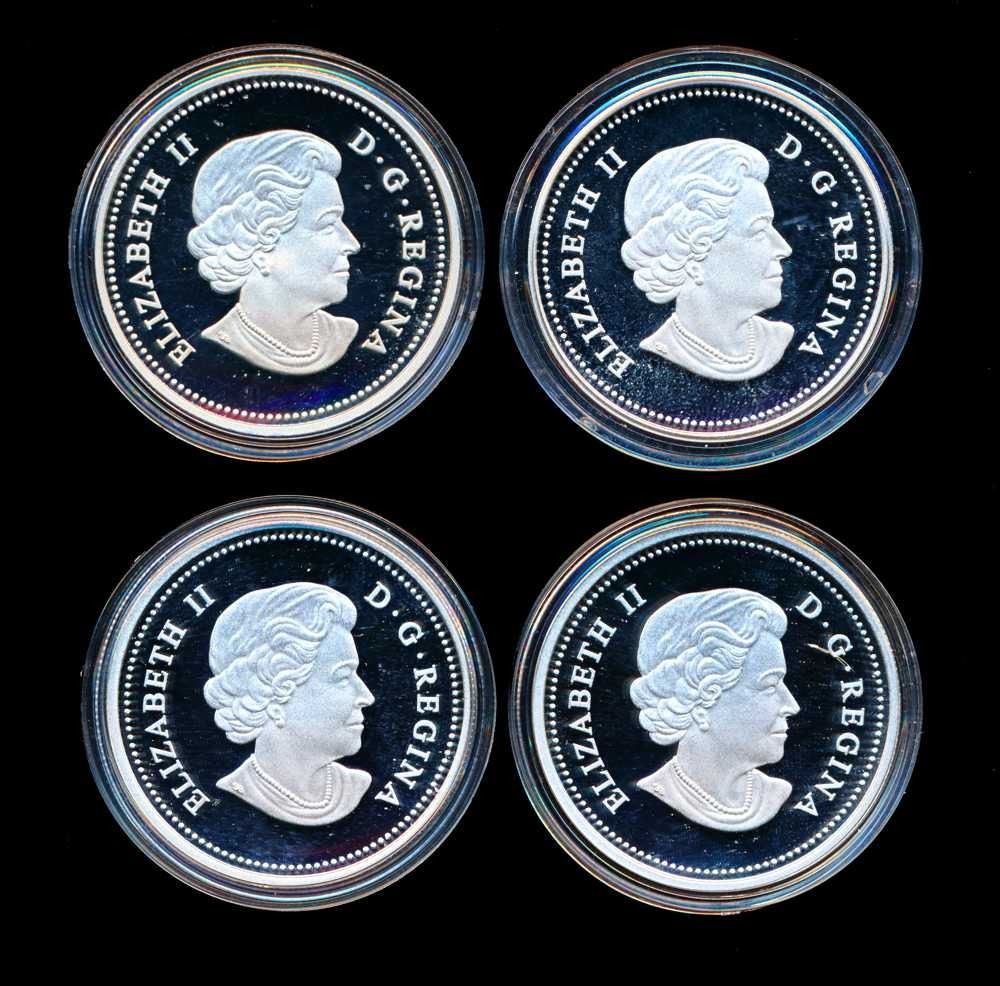 Lot de 4 monnaies du regne d'elizabeth II d'une once d'argent pur. Toutes en capsules, qualite epreuve, dont 1 dans sa boite originale avec document. ASW 4.000 oz.