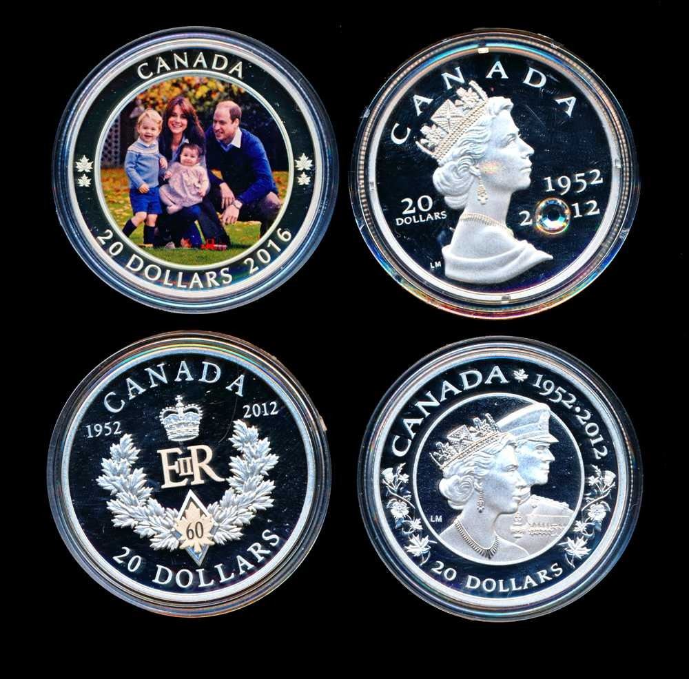 Lot de 4 monnaies du regne d'elizabeth II d'une once d'argent pur. Toutes en capsules, qualite epreuve, dont 1 dans sa boite originale avec document. ASW 4.000 oz.