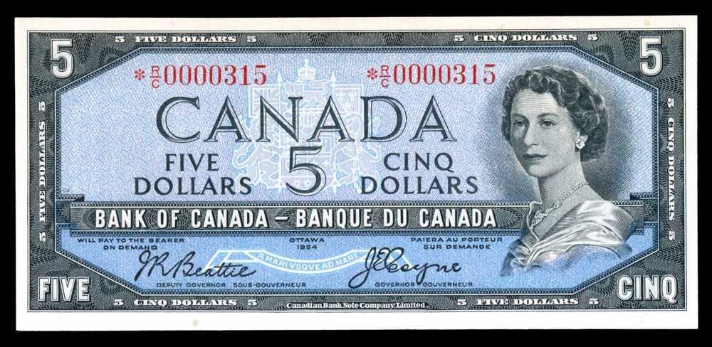CANADA - $5 1954 modifie - Remplacement petit nombre - PMG-65