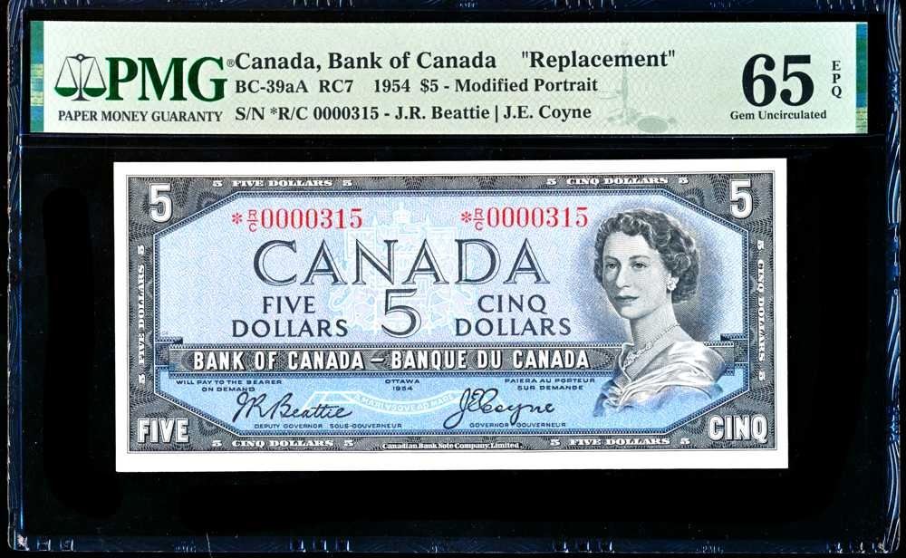 CANADA - $5 1954 modifiE - Remplacement petit nombre - PMG-65