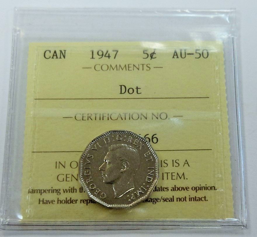 CANADA-5 CENT, 1947 DOT, ICCS AU50