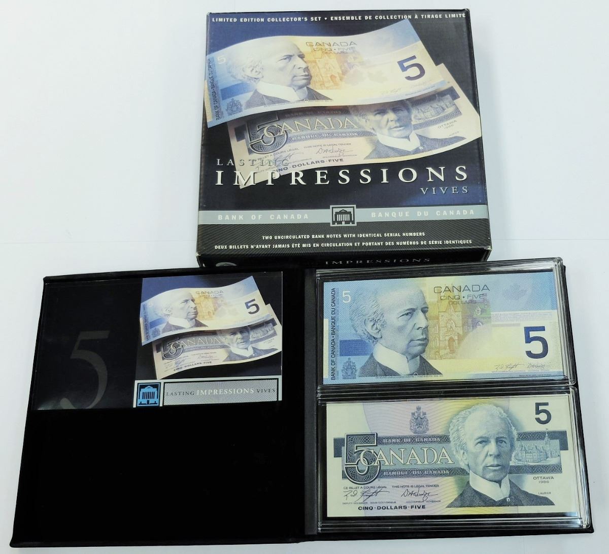 FEATURES 2 FIVE DOLLAR BILLS WITH THE SAME SERIAL NUMBER, 1986 & 2001