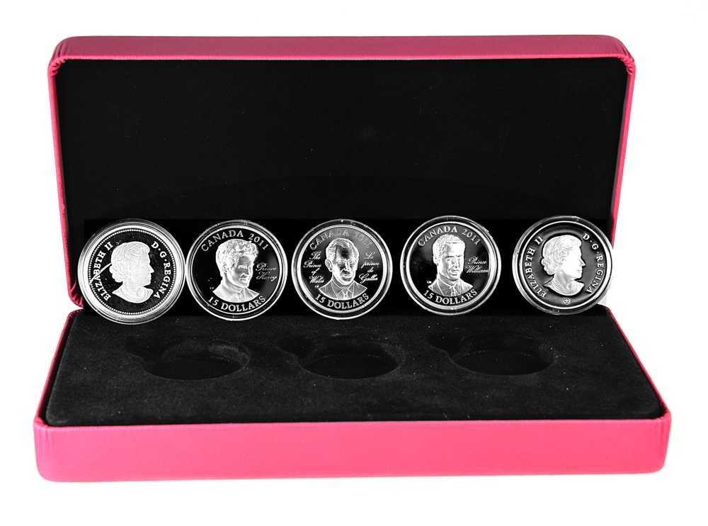 Serie incluant $15 2009 George VI, 2011 Prince Harry, 2011 Prince William, 2011 Prince Charles et 2011 $15 Traditions Chinoises. Toutes en capsules, qualite epreuve. ASW 4.890 oz.
