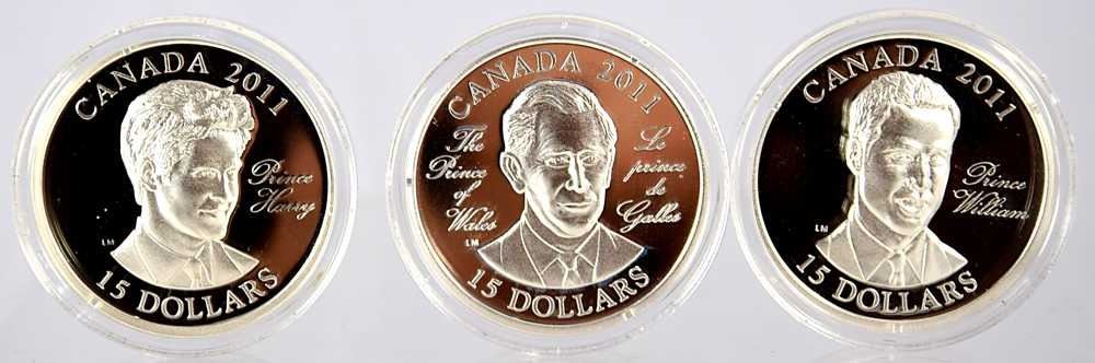 Series including $15 2009 George VI, 2011 Prince Harry, 2011 Prince William, 2011 Prince Charles, and 2011 $15 Chinese Traditions. All in proof-quality capsules. ASW 4.890 oz.