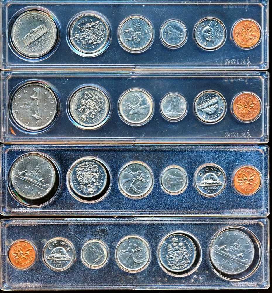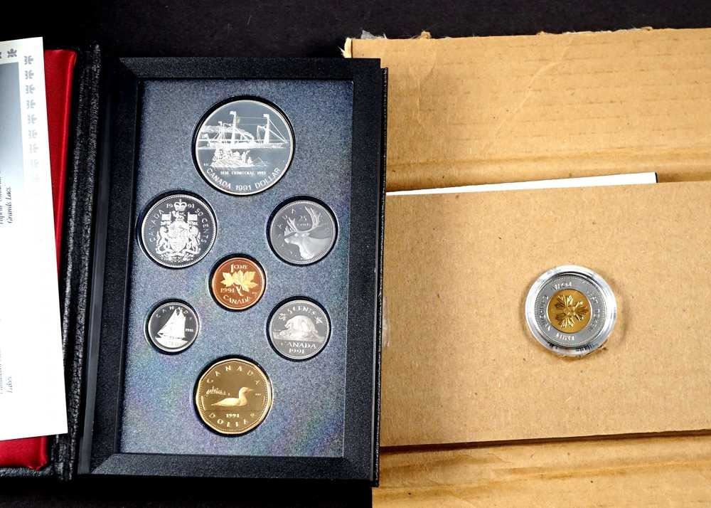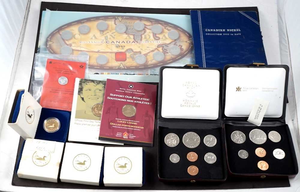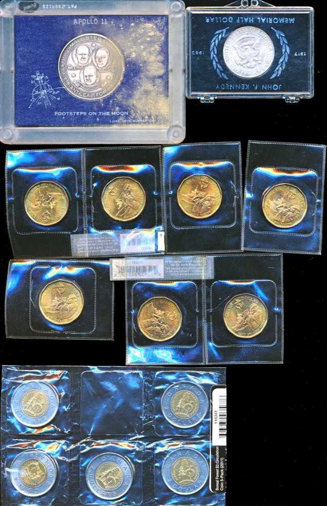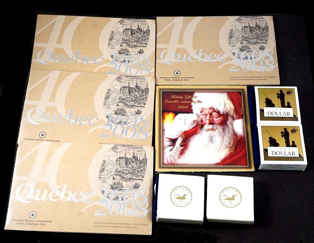 Including the following PL sets: 1968, 2 x 1972, 1973, 1983, 1988, 1989, 1990, 1991, 1993, 1995, 2004 Santa Claus (total 12 sets), SP sets 1978, 1979 (2 sets), PF set 1991 (1 set) with silver dollar. Also in the lot: Apollo 11 medal, 1964 Kennedy half dollar, 5 x 2011 $2 set, 1996 $2 proof, 1996 $2 coin and note set, 7 x 1968-1977 $1 Navy, a Whitman collection of 22 x 5 cents 1968-1977, 1972 Canada-Russia Hockey Commemorative Sterling Pin, 2004 $1, 2005 $1, 4 Quebec 400th anniversary plates, 1999 12 x 25 cent millennium set, 6 x 1987 $1 PF, 2 x 1995 $1 Peacekeeping PF.