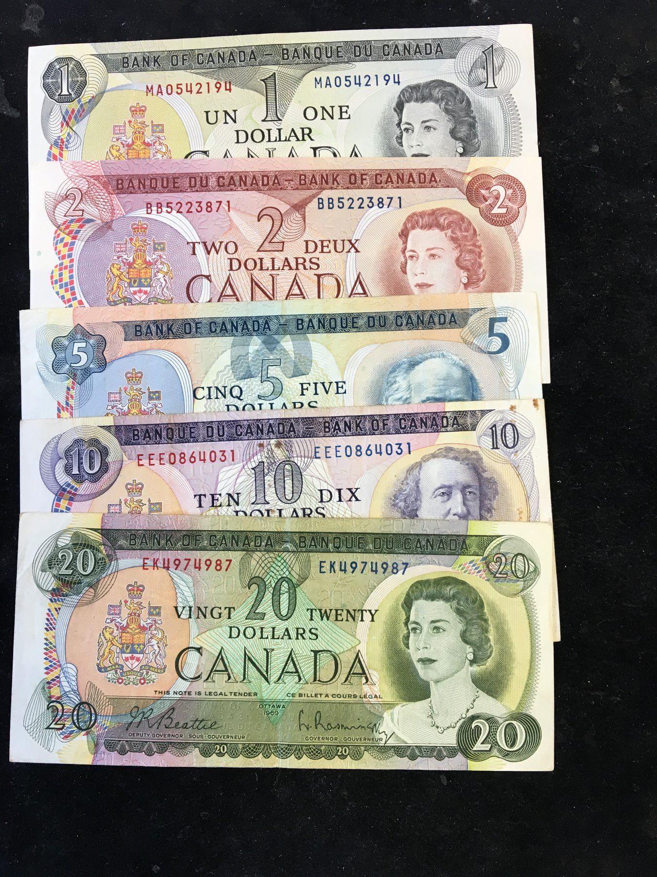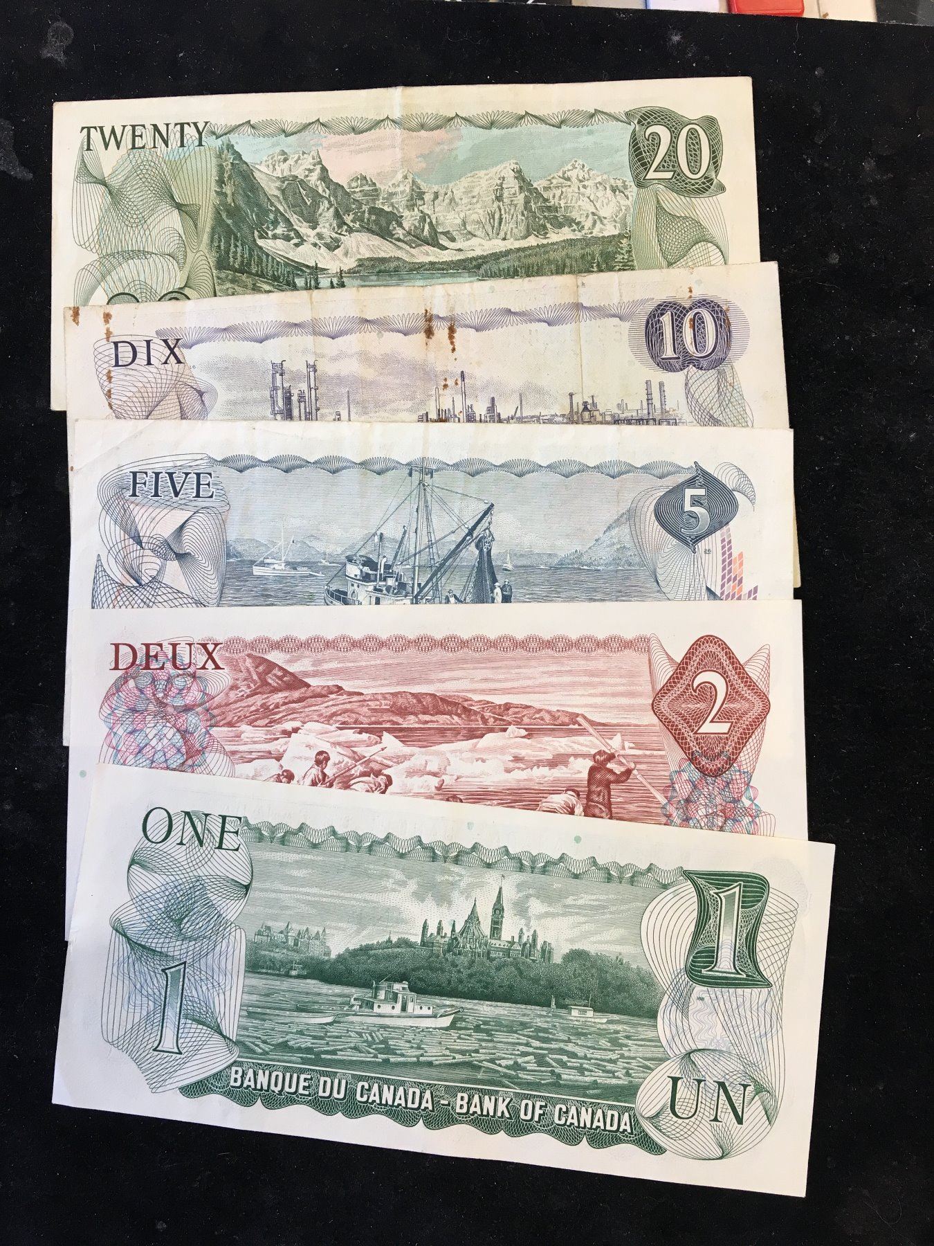 NICE RUN OF CANADA BANKNOTES.1969 $20,1971 $10,1979 $5,1974 $2,1973 $1..NICE LOT GRADES VF-UNC..$10 SHOWS STAINING