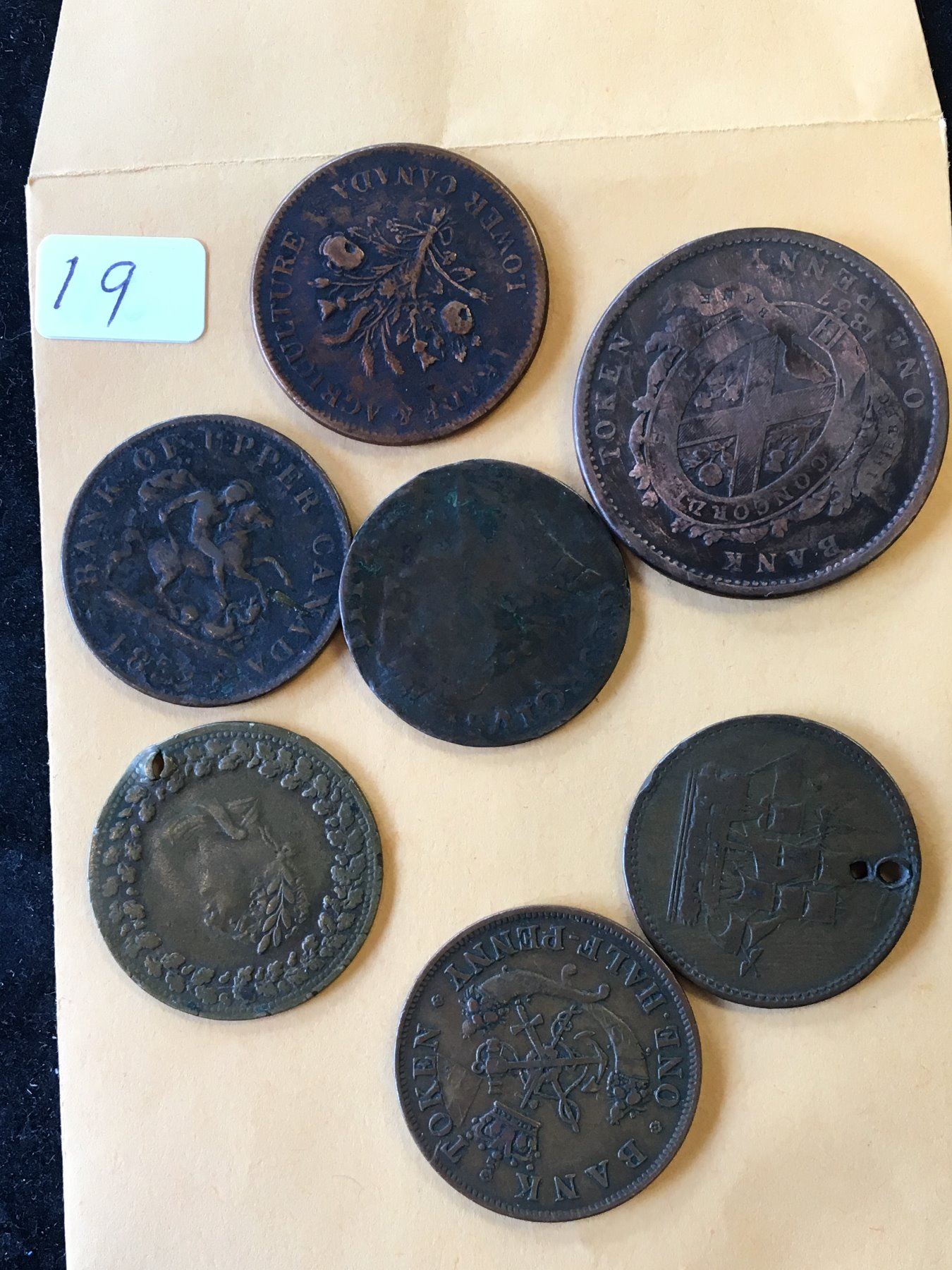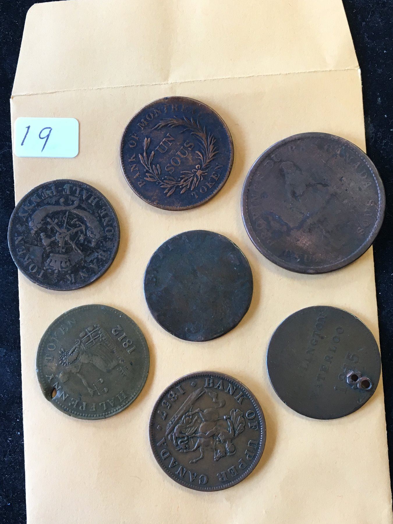 NICE LOT OF ASSORTED TOKENS! BANK OF UPPER CANADA,BOUQUET SOUS,TIFFIN,WELLINGTON ETC..LOWER GRADE LOT