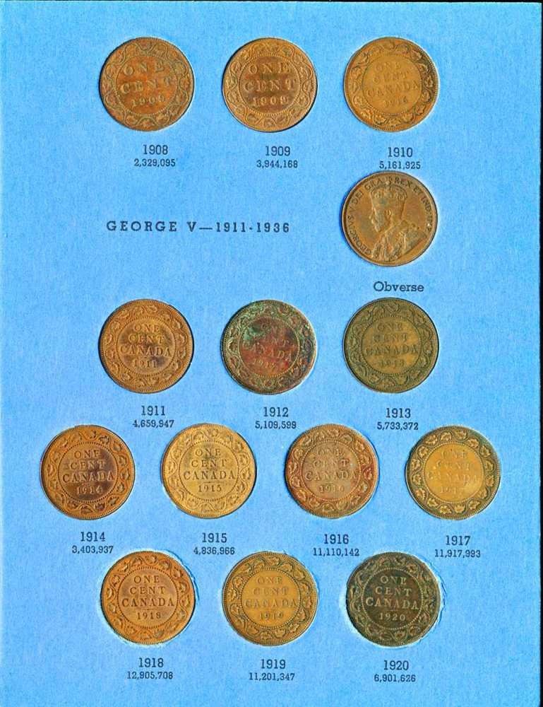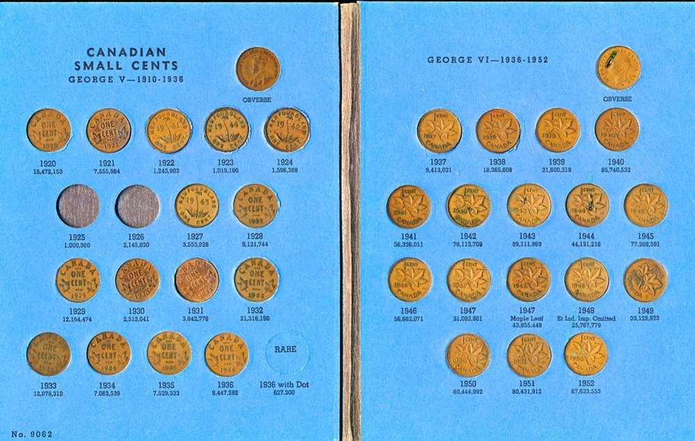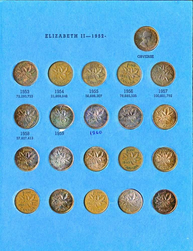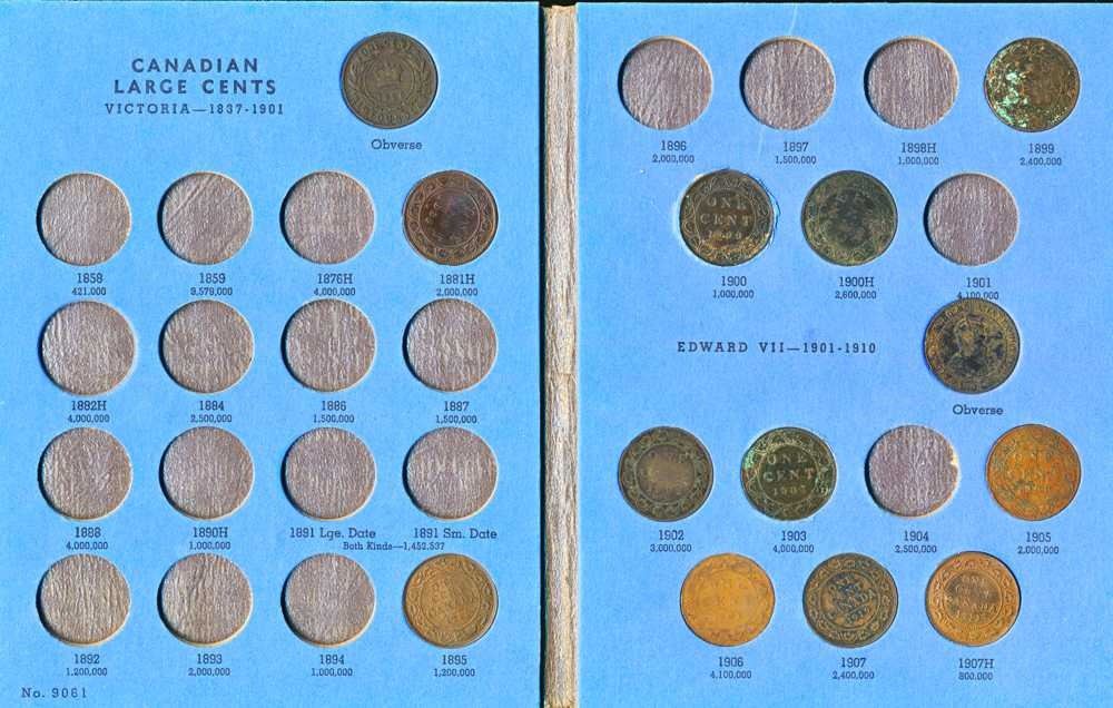 Including 5 Newfoundland coins, 26 large Canadian cents, 1 Newfoundland cent from 1896, 51 small Canadian cents, and 4 Newfoundland cents from 1941-1944. The set comes in two Whitman booklets. An old collection, not checked for variety.